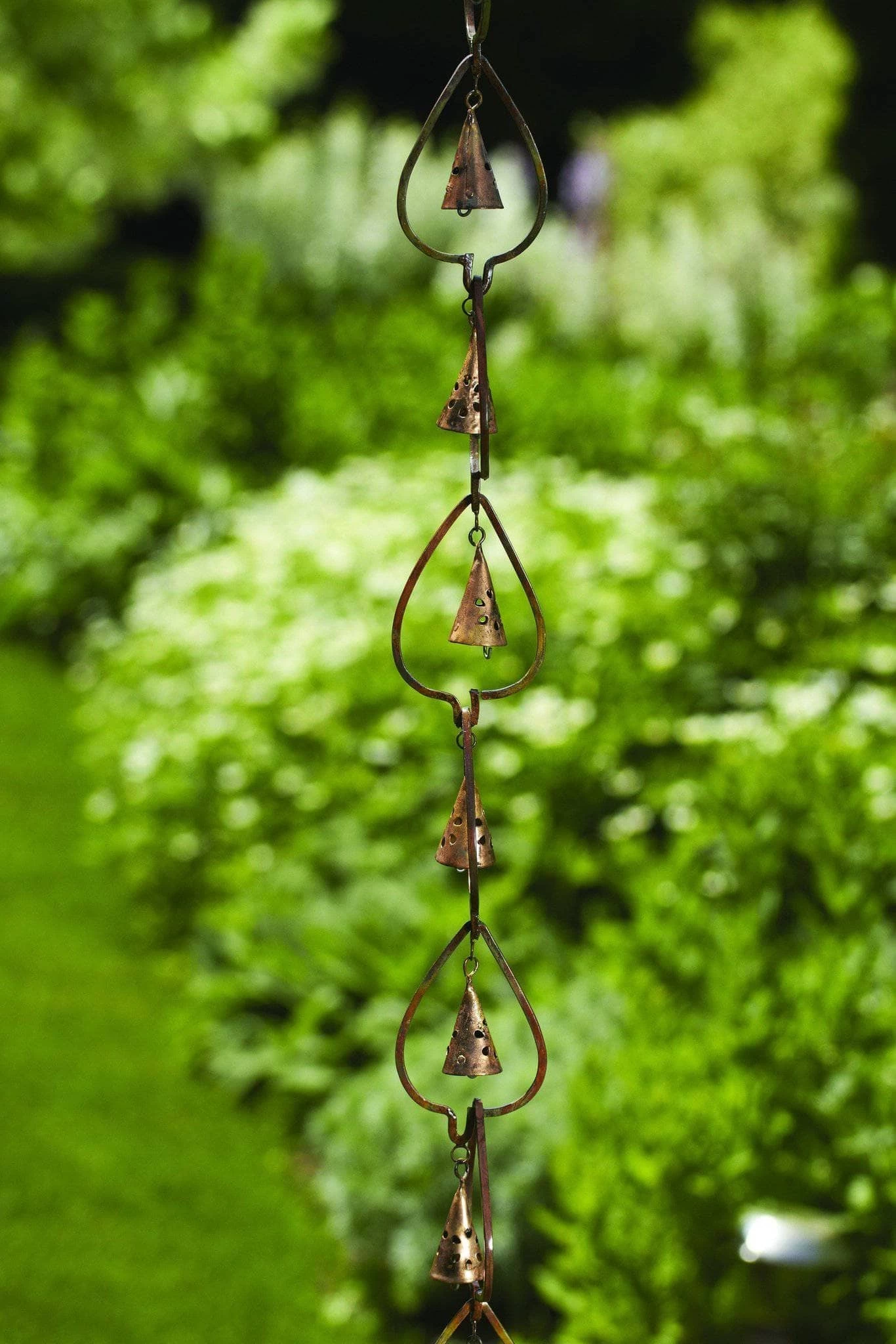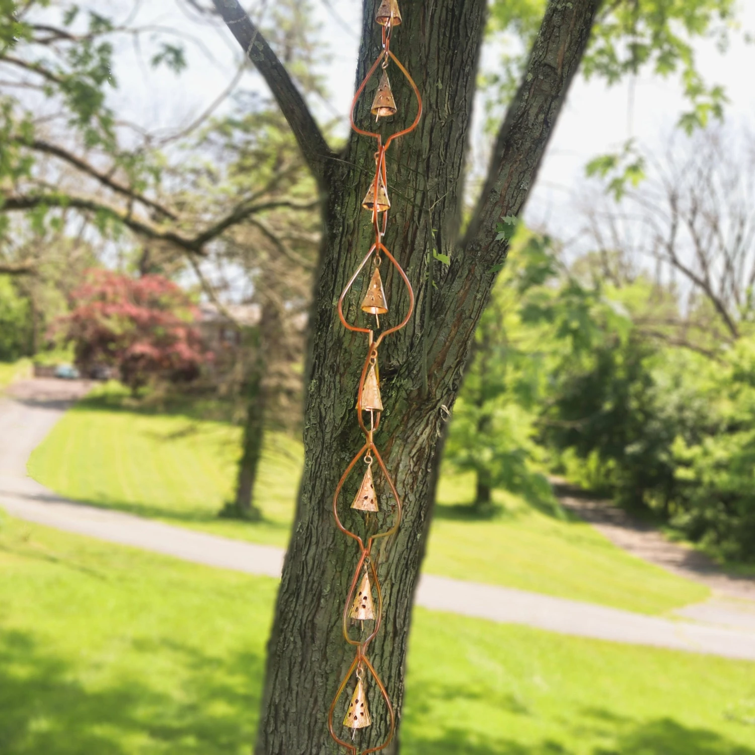 Just like rustling aspen leaves on a quiet summer afternoon, our Flamed Aspen with Bells garden ornament provides a gentle, peaceful sound as it dances and sways. This beautiful piece features stylized leaf outlines, each of which encloses a single, beautiful bell. This look is versatile enough to suit a variety of settings! Like other hanging ornaments from the Happy Gardens collection, this one has been individually handcrafted, and will bring lasting beauty to your lawn, garden, or outdoor living space.
