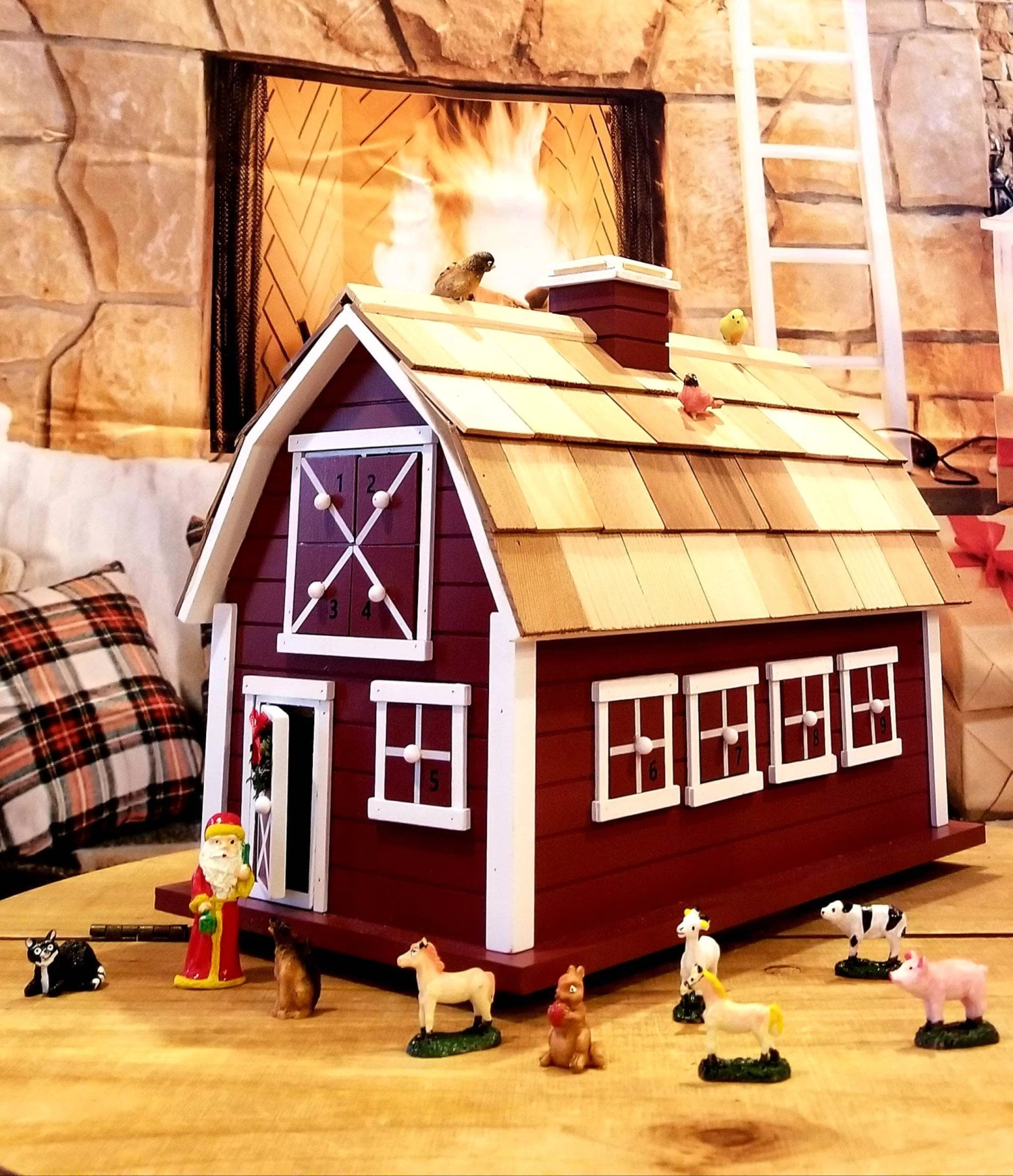 The Barn Advent Calendar holds the excitement for the 24 days before Christmas. Each individual drawer or door holds a barnyard animal: bunnies, cows, horses, rabbits (and many more) as well as Santa in door #24 to complete the countdown to Christmas. Comes with 5 birds which can be perched on the roof of this authentic barn. Perfect for children and families alike, this adorable life-like Advent Calendar will delight everyone as they open up another door each and every night to see what animal is tucked away for them! We have added a turntable so that you can spin the barn around to see all of its decorative features. This piece will be sure to become an heirloom and a treasure that will be used year after year.