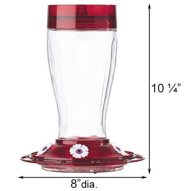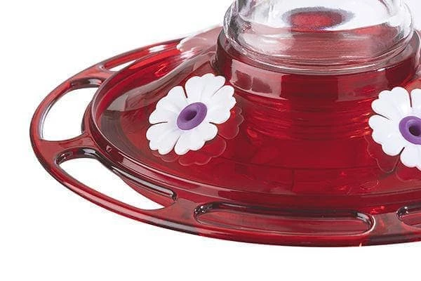 The center, glass reservoir holds a robust, 38 ounces of nectar, and impressed lines throughout this bottle offer dimension to it. The bottle connects to the red, plastic base, and 7 white flowers with purple centers form feeding ports for several birds. A perch aligns with each of these ports for hummingbirds to sit and rest, and this saucer base fully disassembles for thorough cleaning.