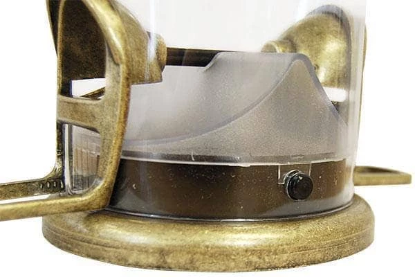 These perches enable cardinals and a bevy of other birds to feed easily, and each of the ports has a wider opening for them to reach seed. The antique brass color of the metal ports, perches, roof, and base bring a classic feel to the item, while forming a durable and lasting feeder. An internal baffle at the base of the seed tube prevents seed buildup, and the innovative, Quick-Clean design helps the item remain clean and hygienic.