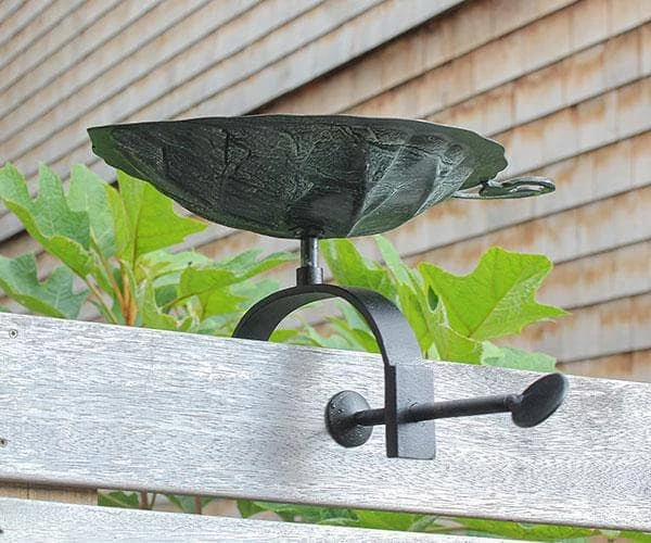 Turn a section of your porch or balcony into a birding haven by placing this Aspen Leaf Bird Bath with Over Rail Bracket on it. Some assembly required.