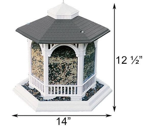 This generous capacity will feed birds for several days, reducing trips outdoors to fill the item. The white cap at the top of the roof lifts for simple refilling, and the included cable allows the feeder to be hung virtually anywhere. Bring a charming look to your garden with this Deluxe Gazebo Bird Feeder. Made in the USA.