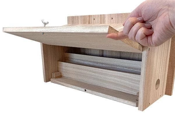 Needles and a lovely pinecone shape further the winter motif, and a thumbscrew keeps this panel securely closed while the shelter is in use. Three predrilled holes on the tall, back lip allow you to place the nest against a wall, or the level base can rest on a tree branch or a few posts with ease.
