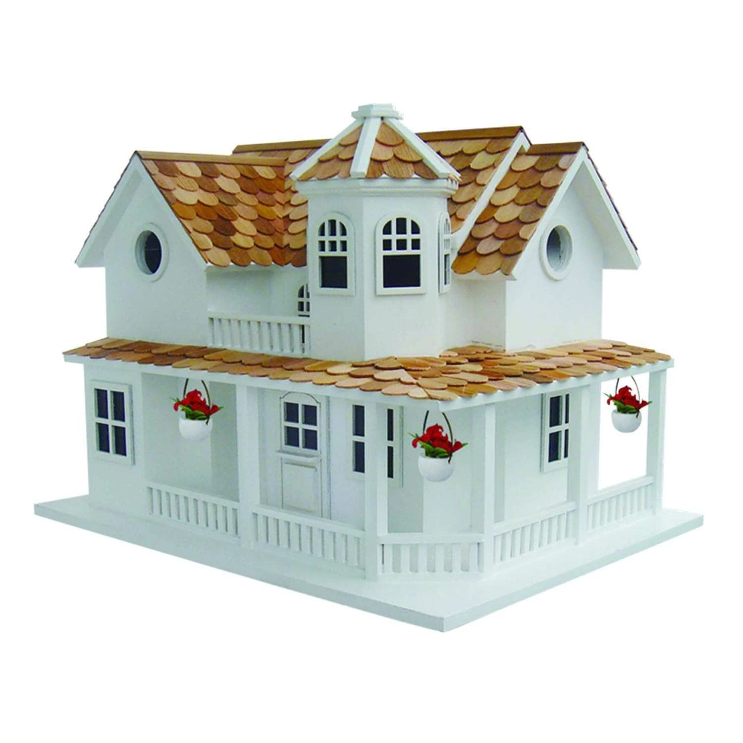 Out on the East End of Long Island, in the toney hamlet of Quogue, you’ll find summer houses just like this Post Lane Cottage. A great, big beautiful wraparound porch and a western red cedar shingled roof, including a turret, are the standout features of this new Signature birdhouse. Three hanging flower baskets adorn the porch. There are two separate nest boxes separated by an interior wall. A removable back wall, drainage, ventilation, an unpainted interior and a 1.25” hole size will accommodate wrens, finches, chickadees, nuthatches and titmice.