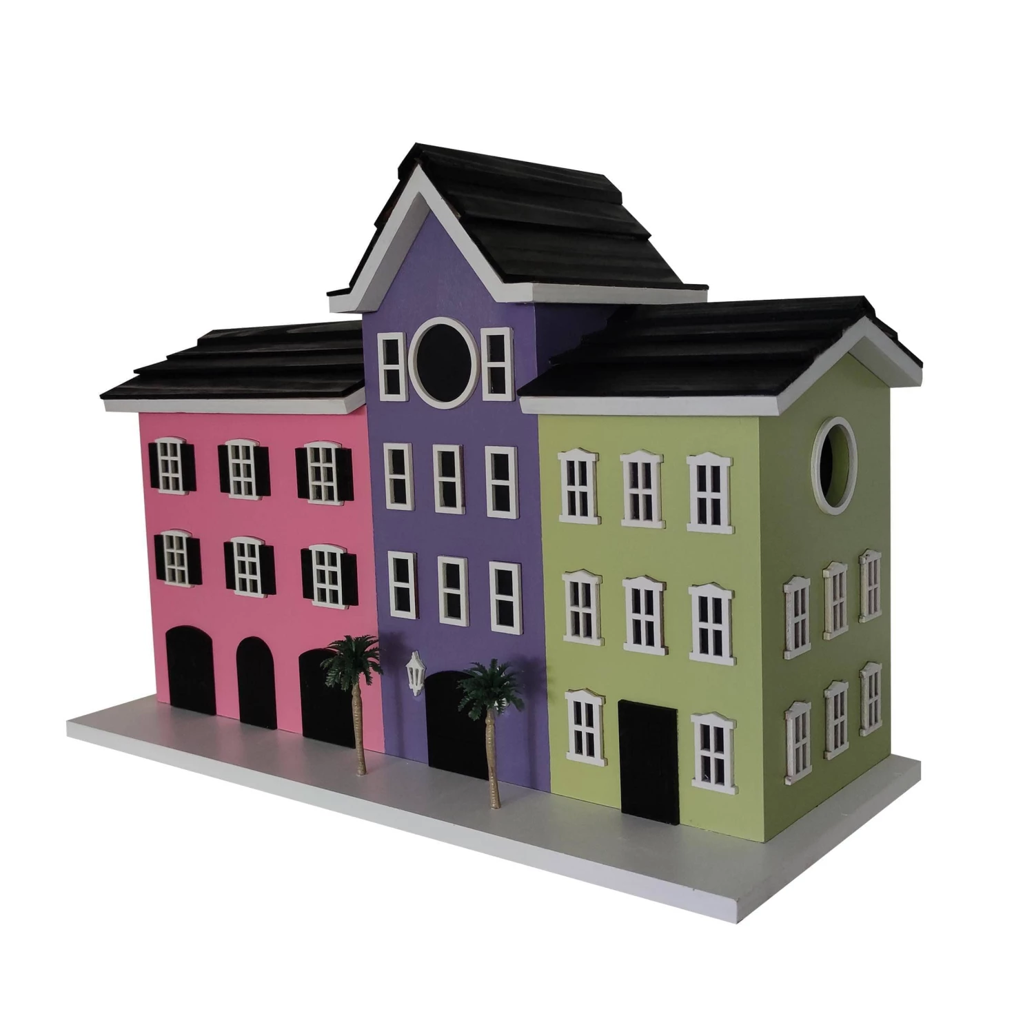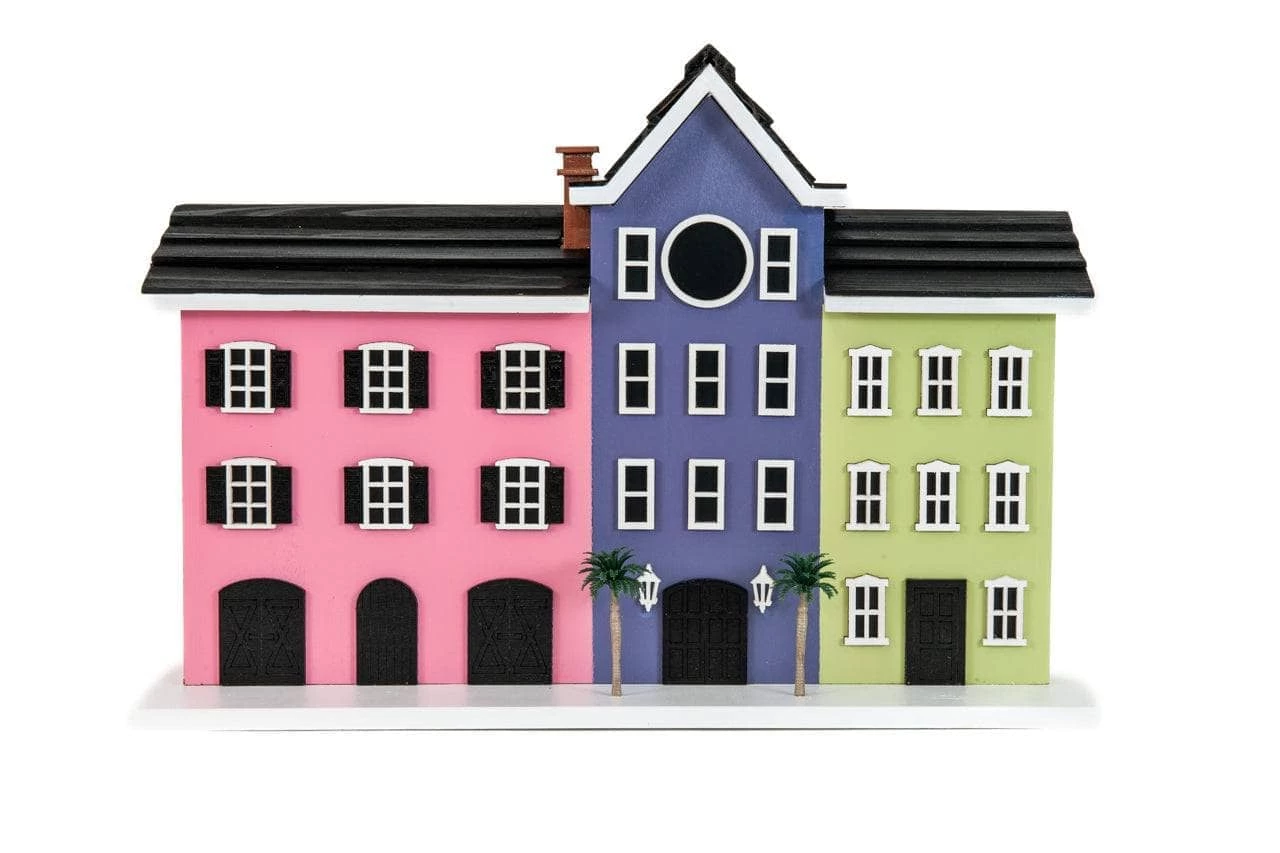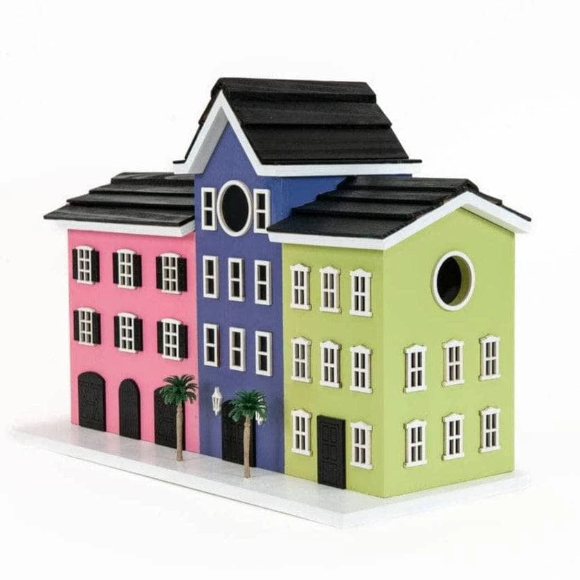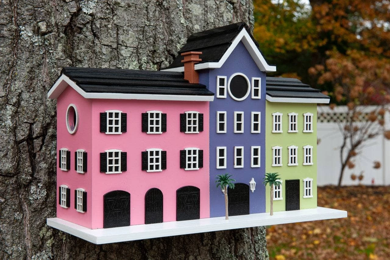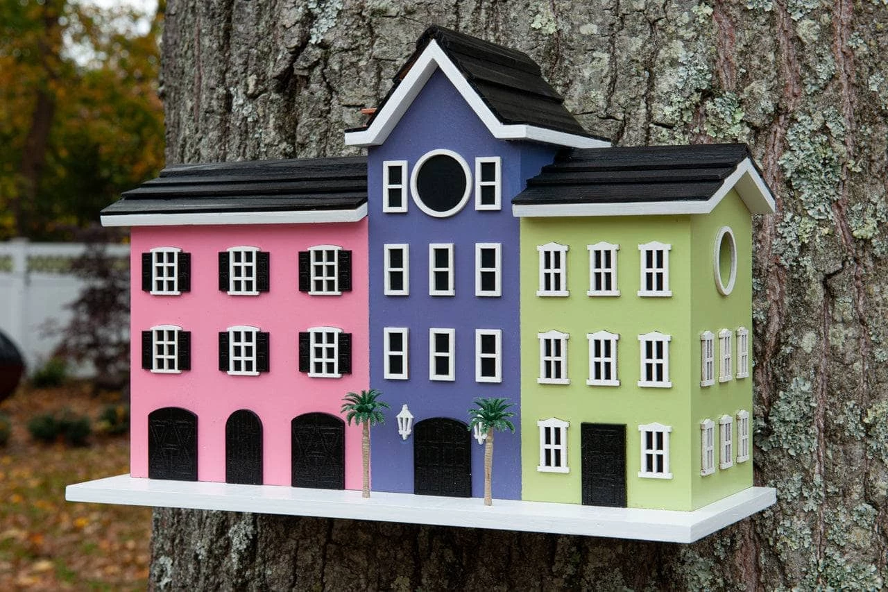 Take a walk along the waterfront along the Battery in Charleston and envision one of the city’s most iconic sites the Rainbow Row houses. Inspired by these brightly colored houses we have created a fully functional birdhouse to replicate the row of vibrant Georgian historical houses. This house will attract your bird visitors for more than just it’s aesthetic charm. Complete with 2 functioning nest boxes, 1.25” hole for small cavity dwellers, ventilation, drainage and a clean out. The 3 houses sit on one platform and can be hung with the two keyhole hooks on the back.