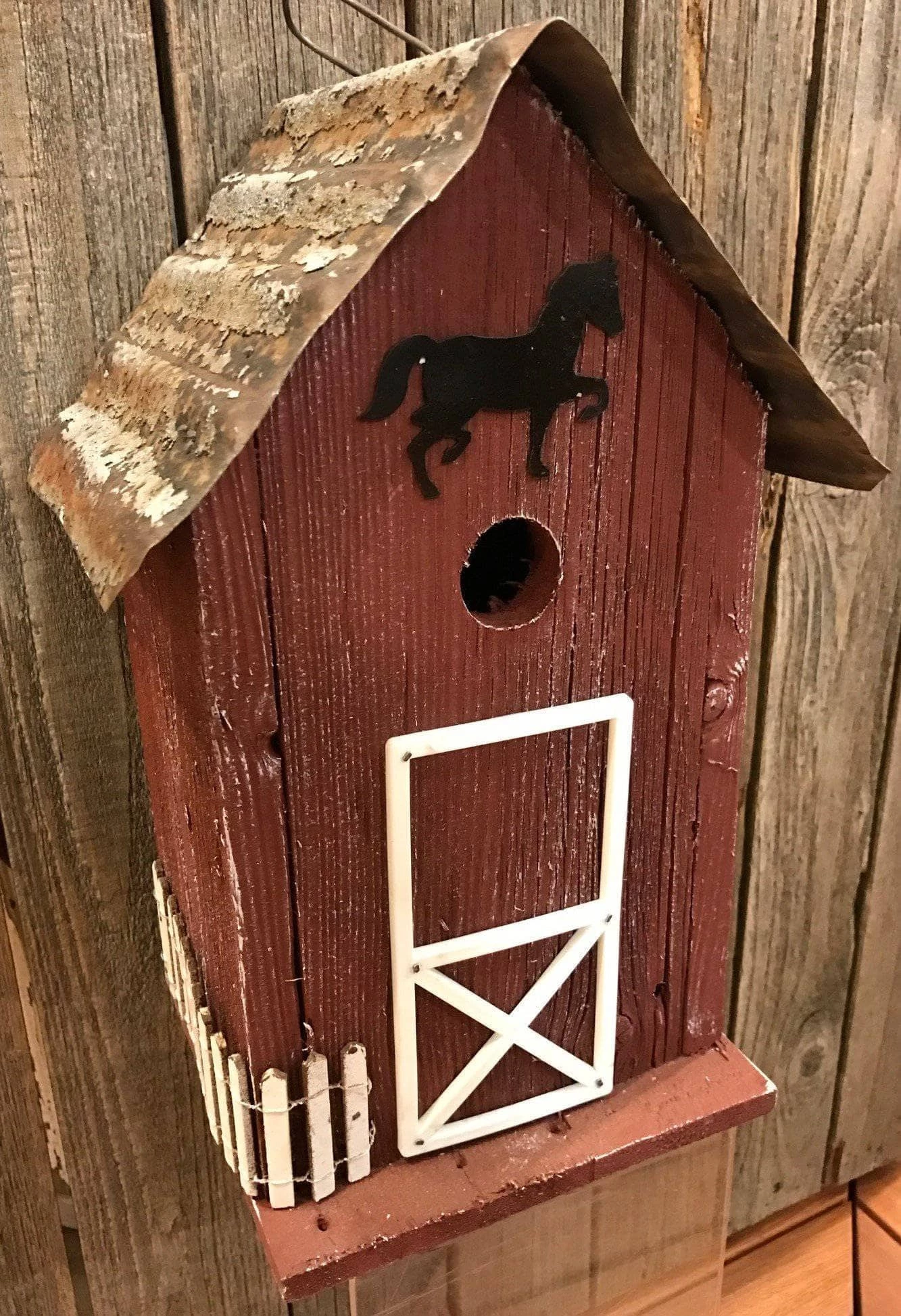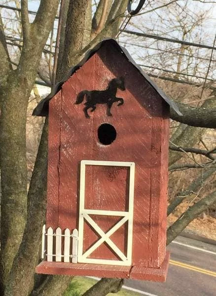 A clean out, ventilation and drainage gives birds a nice home to come back year after year. Decorated with a horse silhouette and white trimmed door and fence. Easy to hang on a fence, post, tree or under an eave. Available in red or white exterior.