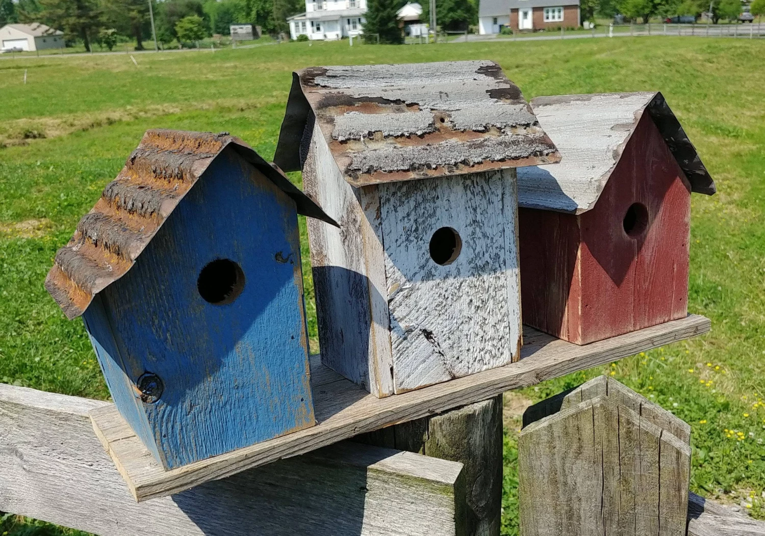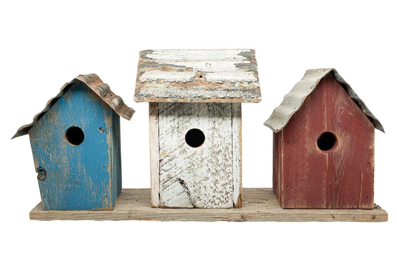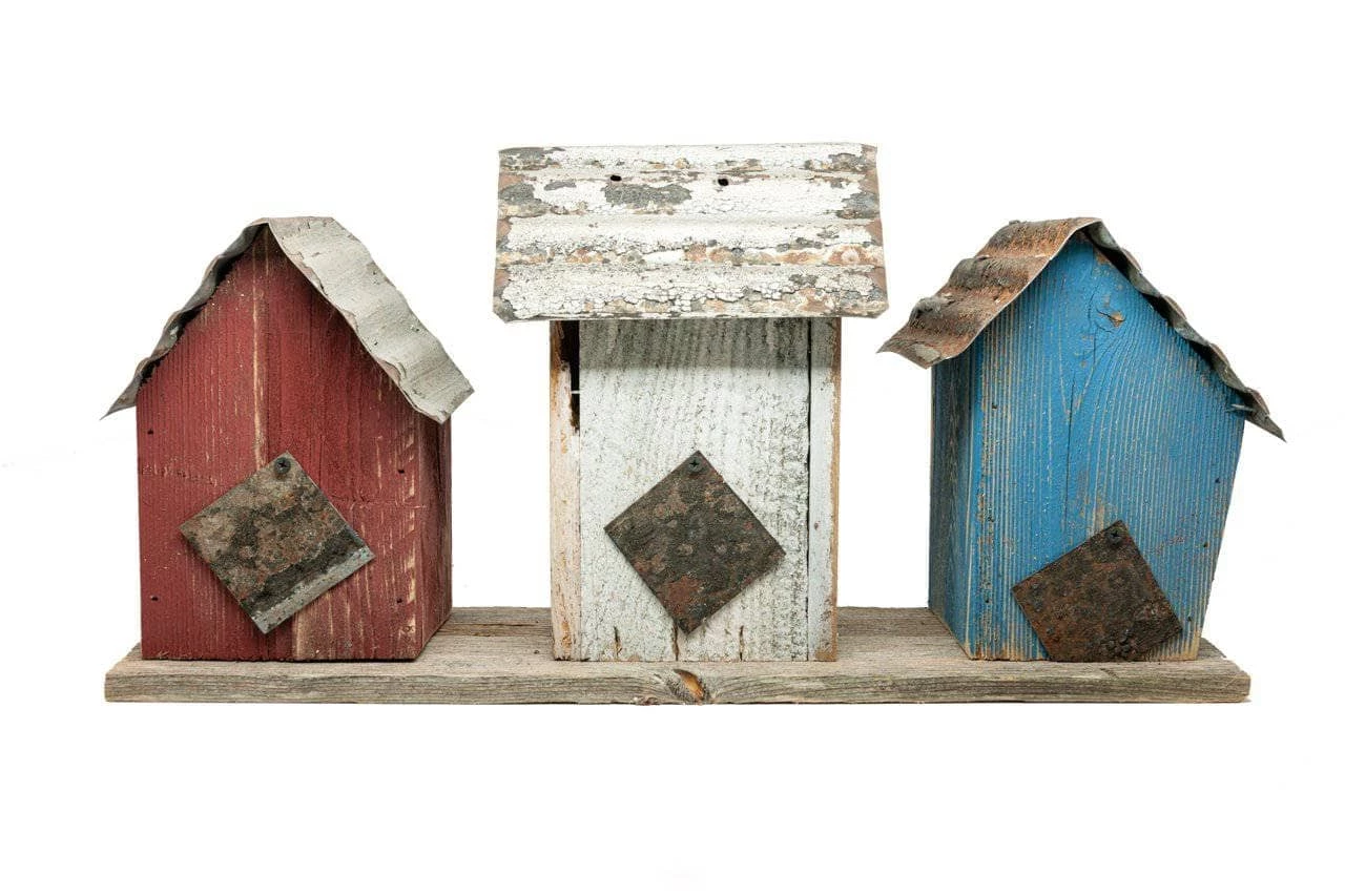 Union Birdhouse Trio- what is better than 1 birdhouse, how about 3 birdhouses on 1 platform. The Union Trio features three individual houses each hand painted in blue, red & white.