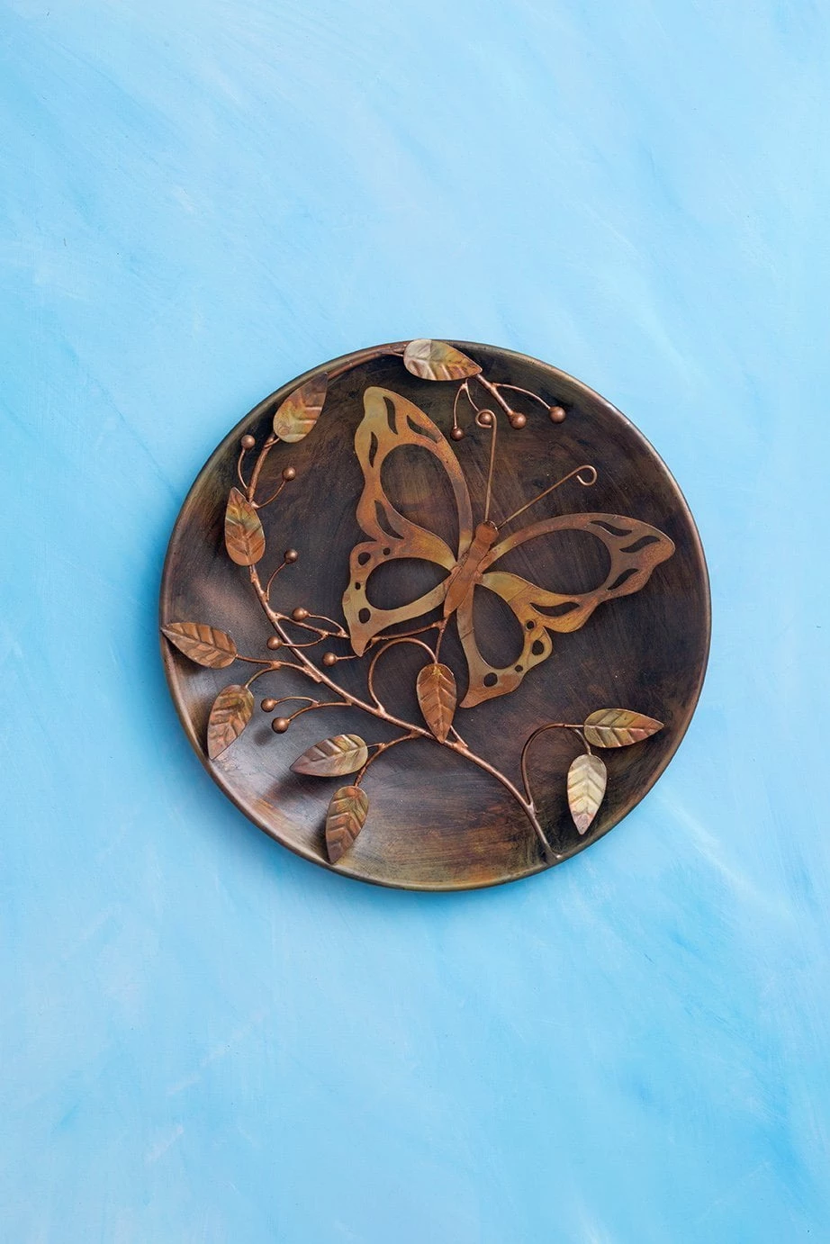Treat any indoor or outdoor space to a special, nature-inspired touch. Our 12” Flamed Butterfly on Branch Wall Disc is perfect for walls, gates, fences, and other blank spaces that require a bit of decoration. A slightly concave back serves as the backdrop for a butterfly of flamed metal framed by a graceful, leafy branch. A wonderful addition to your own space, this piece is sure to make a delightful gift for someone special! Like all décor from our Happy Gardens collection, this wall hanging has been individually handcrafted, and will bring lasting beauty to your surroundings.