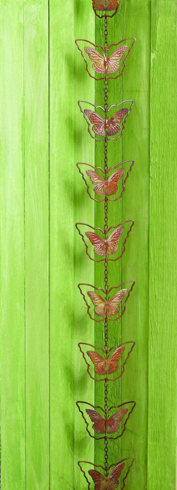 Winged visitors twirl and dance, no matter what the weather! Our Flamed Butterfly Rain Chain sparkles in the sunlight thanks to its unique iridescent finish, and when wet weather comes, it sends water trickling down to the earth. Like other Happy Gardens rain chains, this one has been individually handcrafted, and will bring lasting beauty to your home’s exterior.