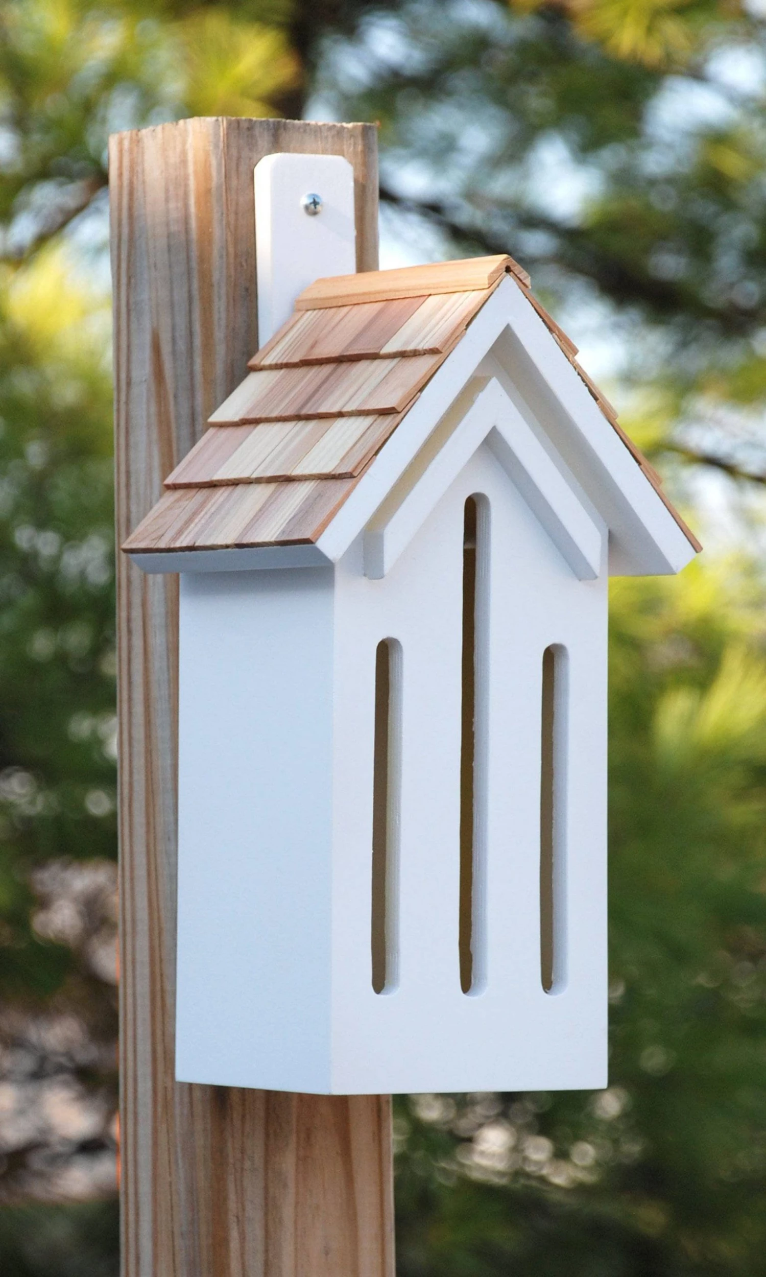 The front panel of this shelter has three elongated slots, mimicking crevices in wood piles or bark that butterflies often use for protection. A pitched roof covers the roost, with cedar shakes on it for added design.