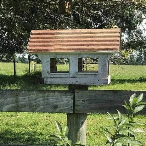 Perfect for any setting, this feeder is constructed of recycled and reclaimed wood with a metal roof. Finished with a white washed outdoor paint. The large, open area can be filled with seed or can easily accommodate a piece of fruit for Orioles to enjoy. A custom-fit mounting plate makes installation to a standard wooden 4 X 4 or fence post.