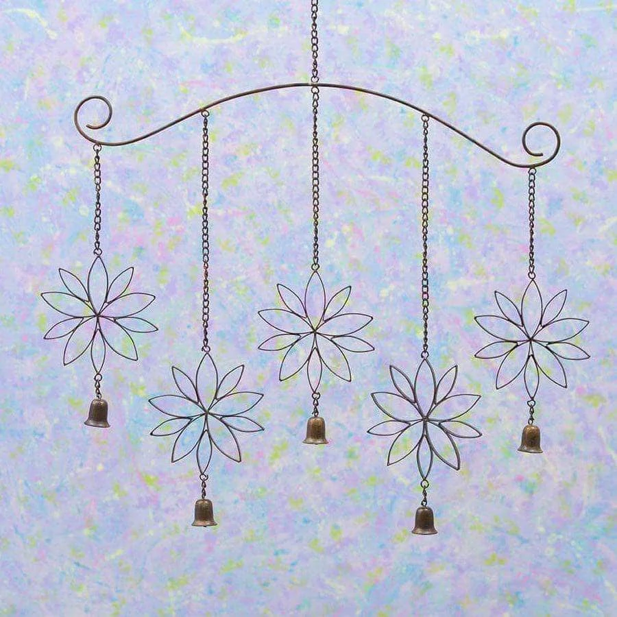 Celebrate the classic daisy with this classic, flamed metal windchime. Simple and sweet, this piece features five flower cutouts and five corresponding bells. This is the kind of charming chime that’ll have your neighbors wondering what fantastic vintage shop you found it in! Hang it from your favorite tree and enjoy! Like all our wind chimes, this piece has been handcrafted and built to last.