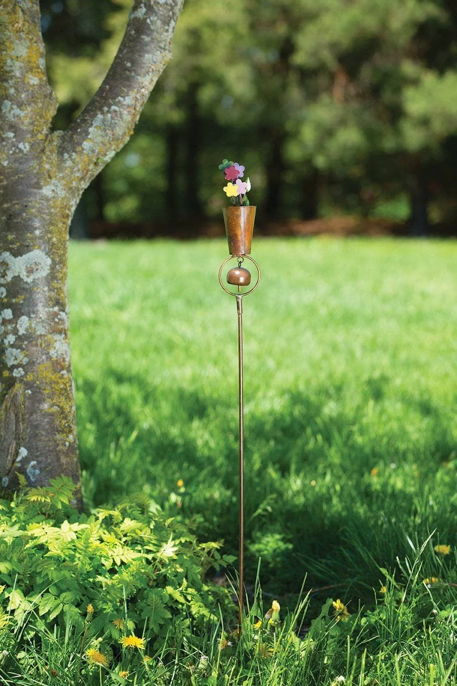Treat your landscape to a whimsical touch! Our Flamed Flower Pot Garden Stake features a tapered flower pot of flamed metal, filled to the brim with a colorful bunch of painted metal flowers. A single, rounded bell chimes softly as breezes make their way from one place to the next. Like all décor from our Happy Gardens collection, this garden stake has been individually handcrafted, and will bring lasting beauty to your landscape.