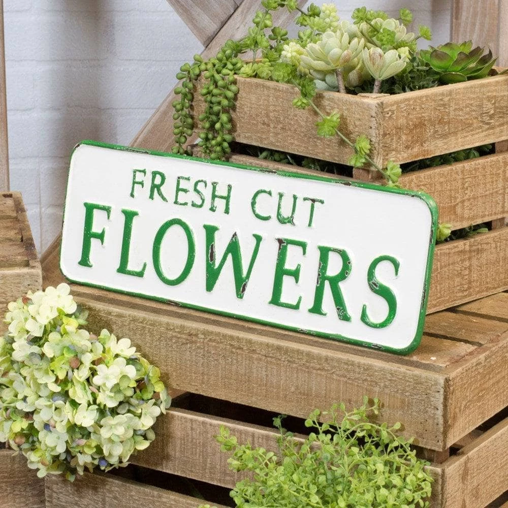 Looking to add a touch of vintage style to your patio, walkway, or flowerbed? This fresh-cut flowers sign—which has been inspired by idyllic flower shops across the United States—features emerald and white details and a weathered, distressed charm. No matter where you place it, this handcrafted piece will never go out of style.