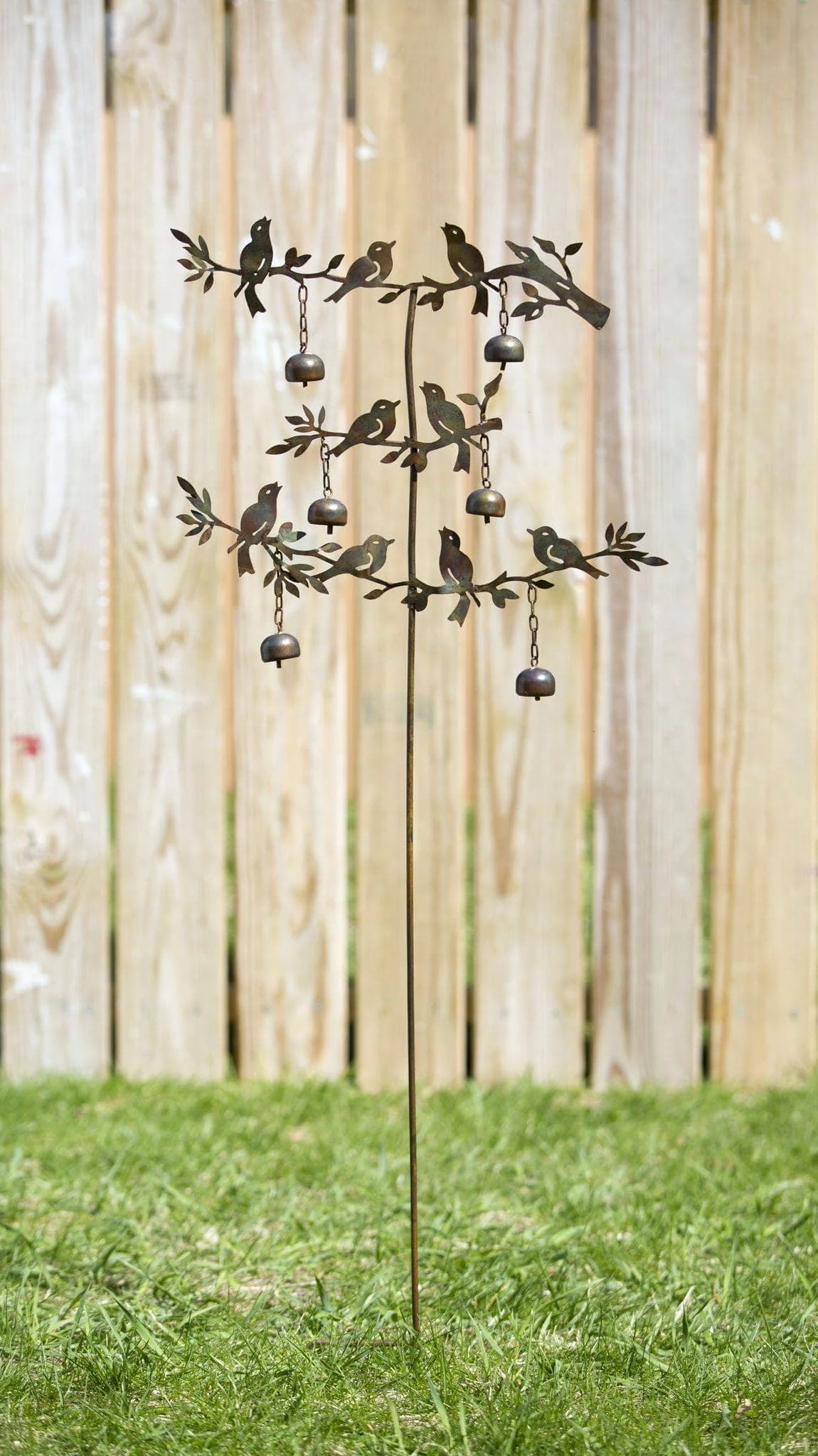 This Birds and Branches Stake brings a chipper chirp to everyday life. Flame-finished metal birds mingle while perched atop several handcrafted branches. Tiny bells dangle from those branches, sending out simple melodies with every single breeze. Stake it in your vegetable garden, your favorite rosebush, or anywhere else that needs a little dash of charm.