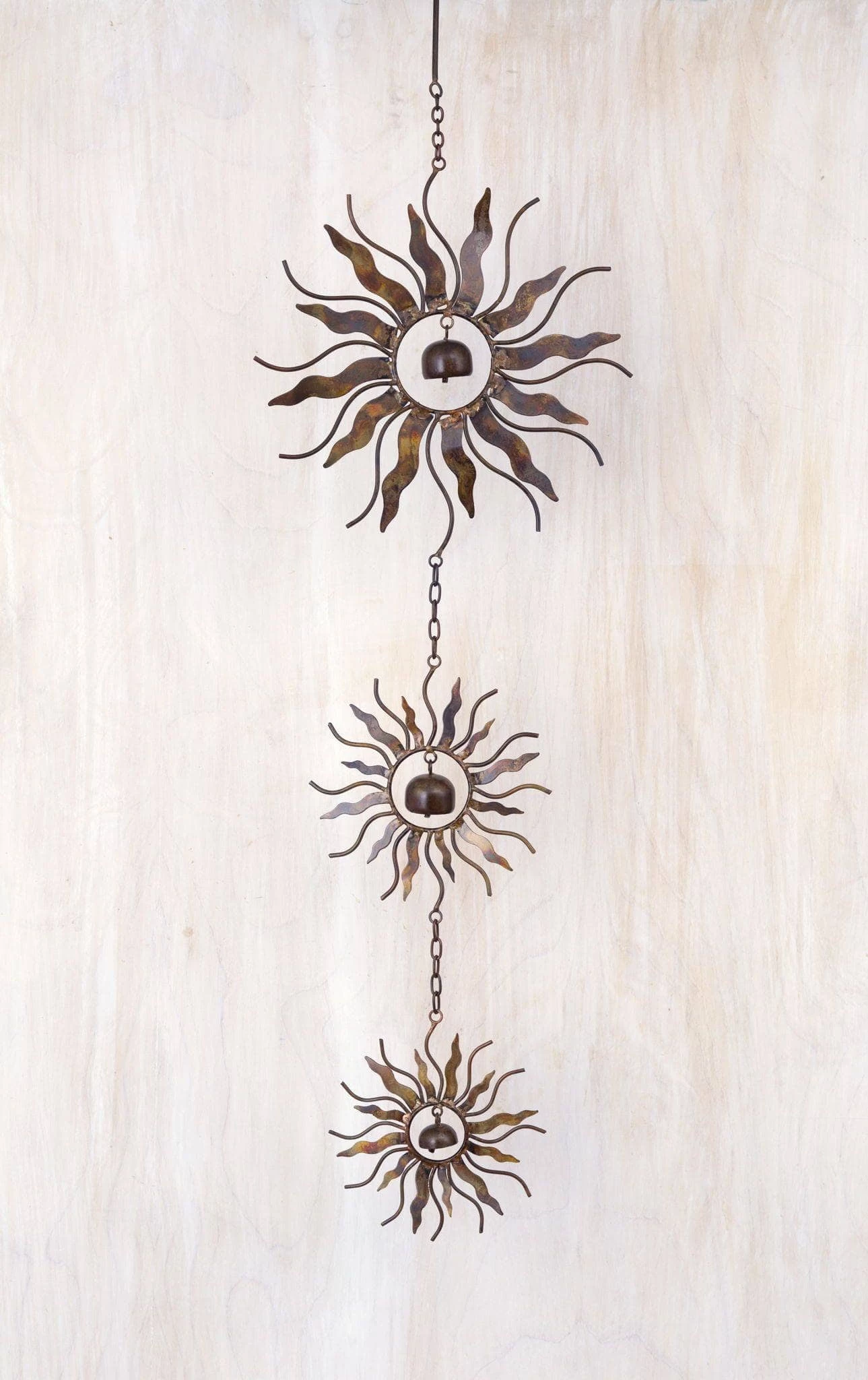 Why feature one sun and one bell, when you can showcase three? Our Graduated Sun and Bell Trio is the perfect addition to any garden, porch, or overhang. This handcrafted piece, which is finished in a flamed metal patina, looks good in every style of backyard, from rustic to modern. Best of all, this unique ornament will keep your outdoor space feeling three times as bright—even on a dreary, wintery day.