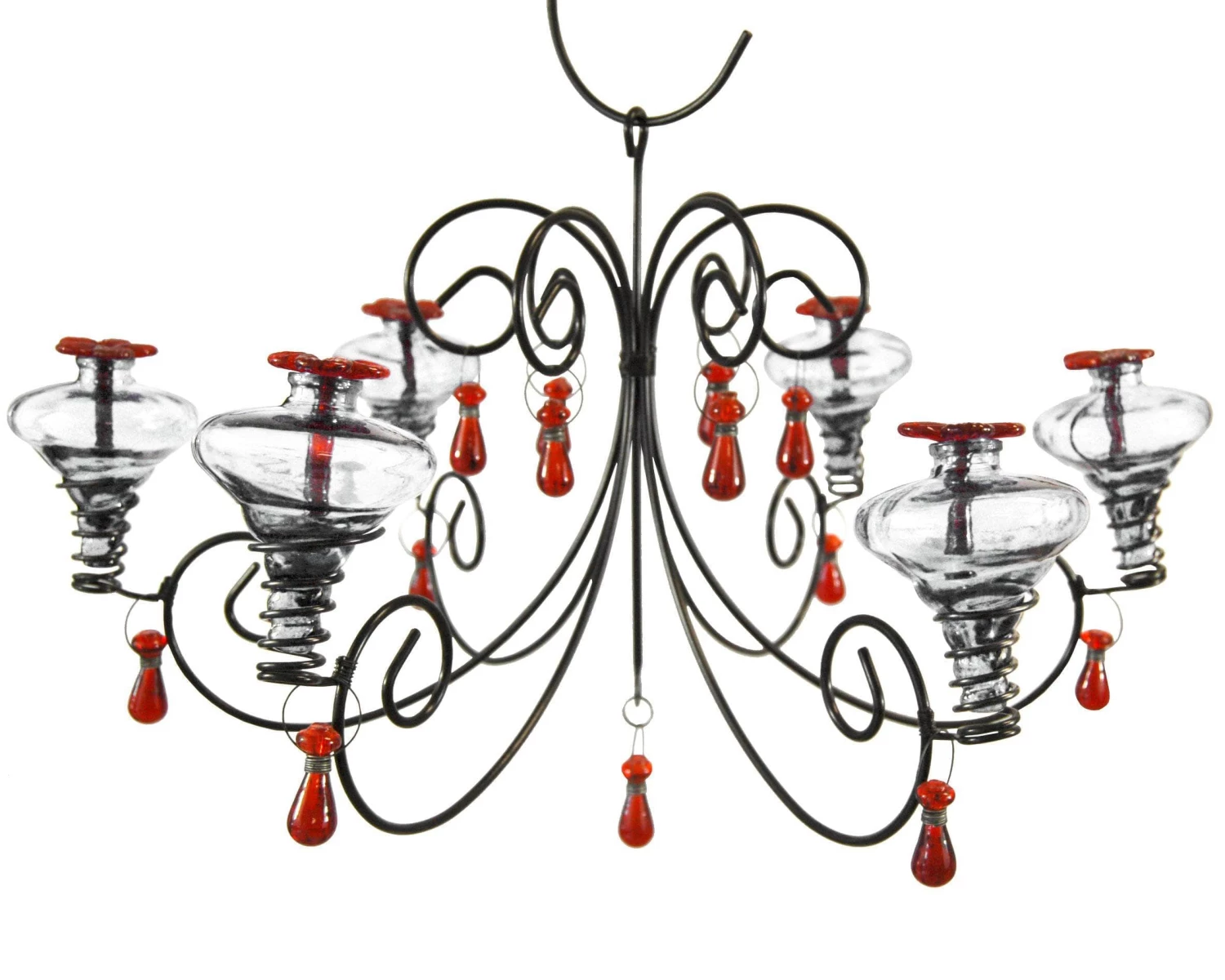 Brighten your day by seeing a wealth of hummingbirds dine from this Clear Grand Mini-Blossom Chandelier. This generous station brings drama and old world charm to your garden at once, with its curved frame and striking, clear glass vessels. Scrolls at both the top and bottom of the six metal arms evoke a chandelier, and red, glass droplets hang from this frame to further the look.