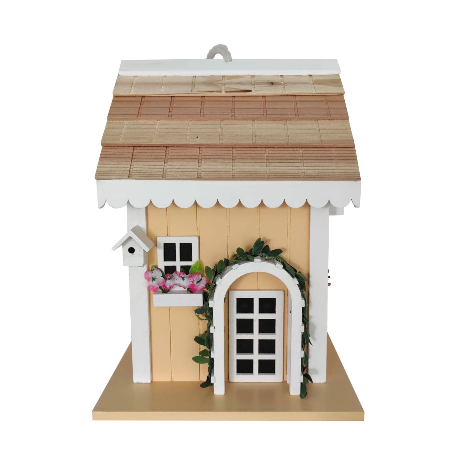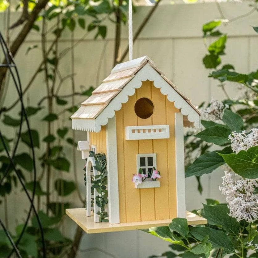 The Groundskeepers Cottage birdhouse in a daffodil yellow has a wealth of classic details including a pine shingled roof, an arbor around the front door, decorative flower boxes and even a miniature bird house out front! This Cottage has all of the qualities a birding enthusiast seeks such as a back wall cleanout, drainage, ventilation, unpainted interior and a 1.25″” hole to invite nesting birds in and keep larger ones out. The finish is an outdoor, water-based, non-toxic paint. Likely inhabitants may include chickadees, nuthatches, wrens and titmice. A heavy- duty nylon cord makes hanging this beautiful birdhouse.