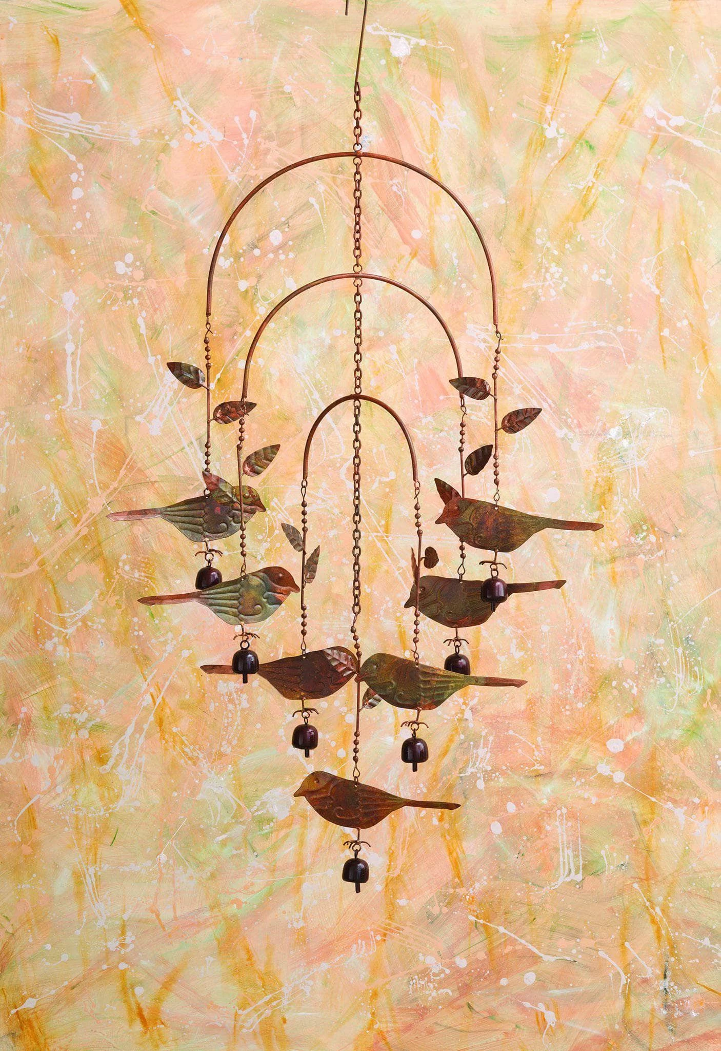 Celebrate Mother Nature’s majesty with this Hanging Birds with Bells Wind Chime. This unique wind chime features seven individually handcrafted birds, each with its own cute little bell. Adorned with rustic, charming leaves, this item is finished in a natural, flamed metal that looks good in every garden. This wind chime, which is sweet and stunning but subtle, makes an excellent gift for family, friends and even a new neighbor.