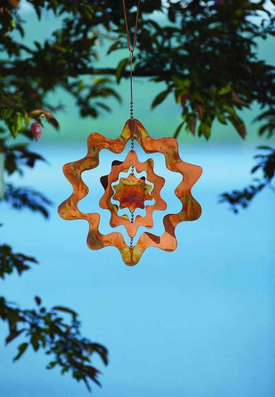 Adorn your patio, porch, or favorite tree with our Hanging Sunburst Triple Spinner. Sized to fit a variety of spaces without overwhelming, yet large enough to serve as a beautiful focal point, this spinner features a strong bead chain for maximum movement. A flamed metal finish catches the sun’s light, showcasing an entire spectrum of stunning colors. Wherever you place it, this sunburst spinner is certain to provide endless enjoyment. Like all Happy Gardens spinners, this one is handcrafted, and brings lasting beauty to your landscape.