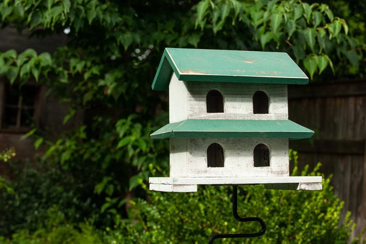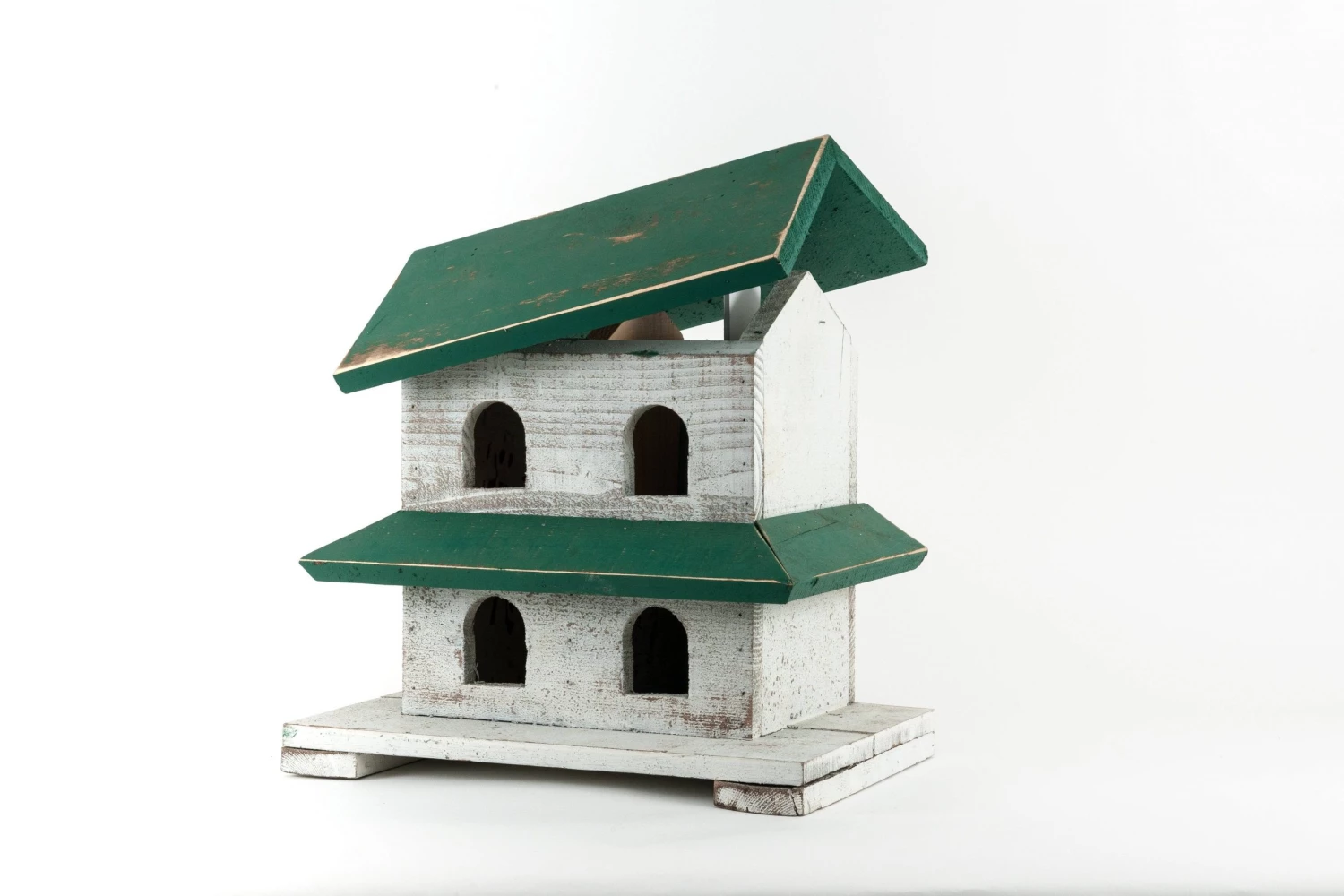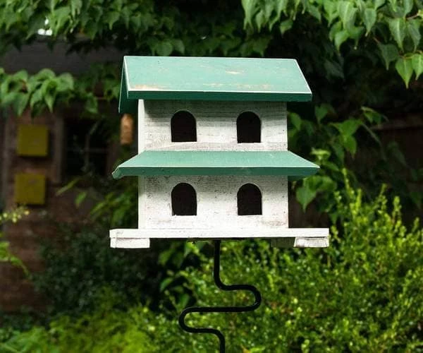 Purple Martins prefer housing that is placed in open areas with clear flyways. Choose the center of the largest open spot available, about 30-120 feet from human housing and at least 40-60 feet from trees. Made of reclaimed recycled barn wood, this house will last for years to come. White with a green roof. This house has 4 holes and a clean out for annual spring cleanings and enjoy watching the birds