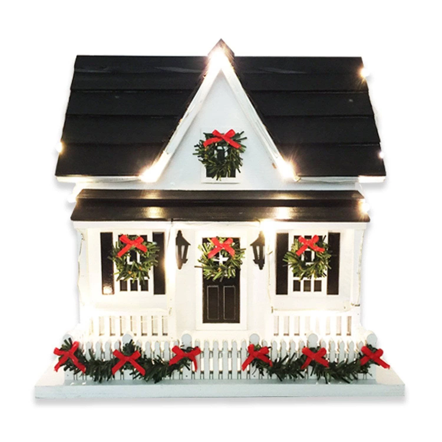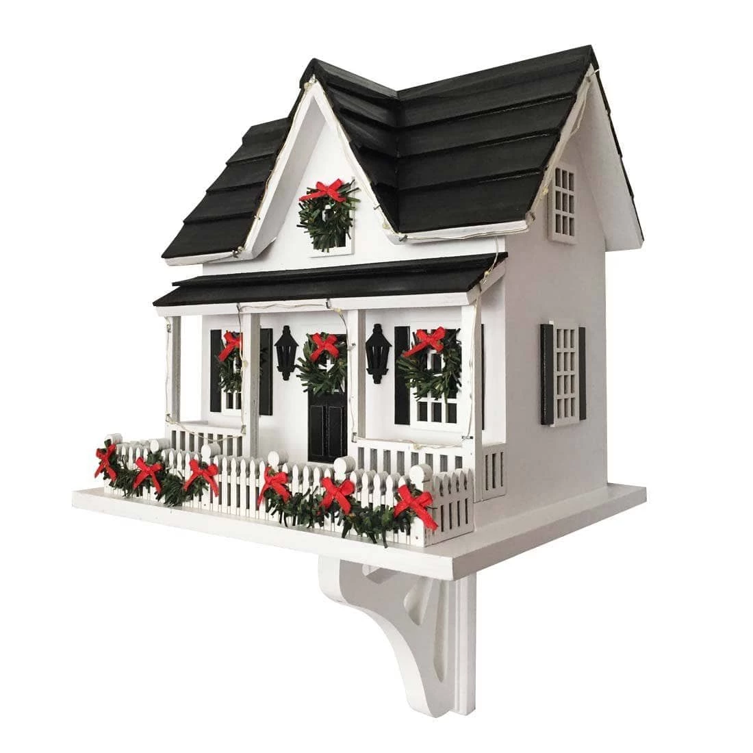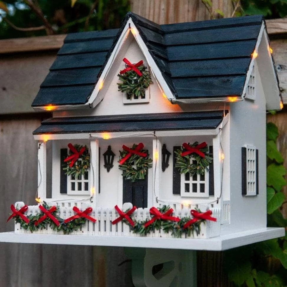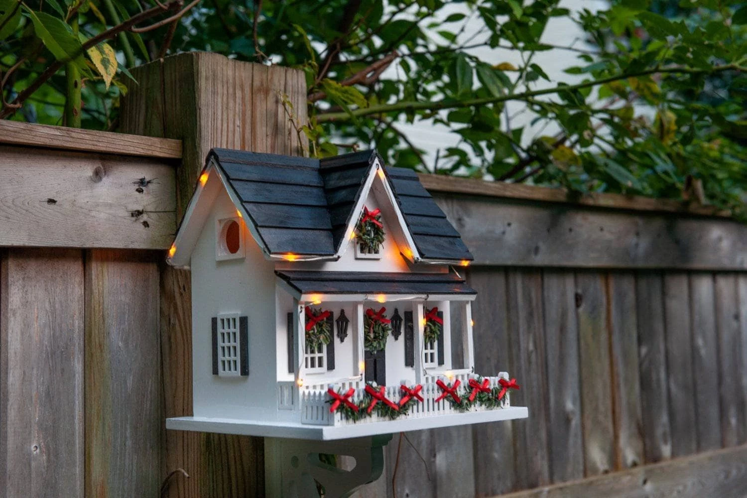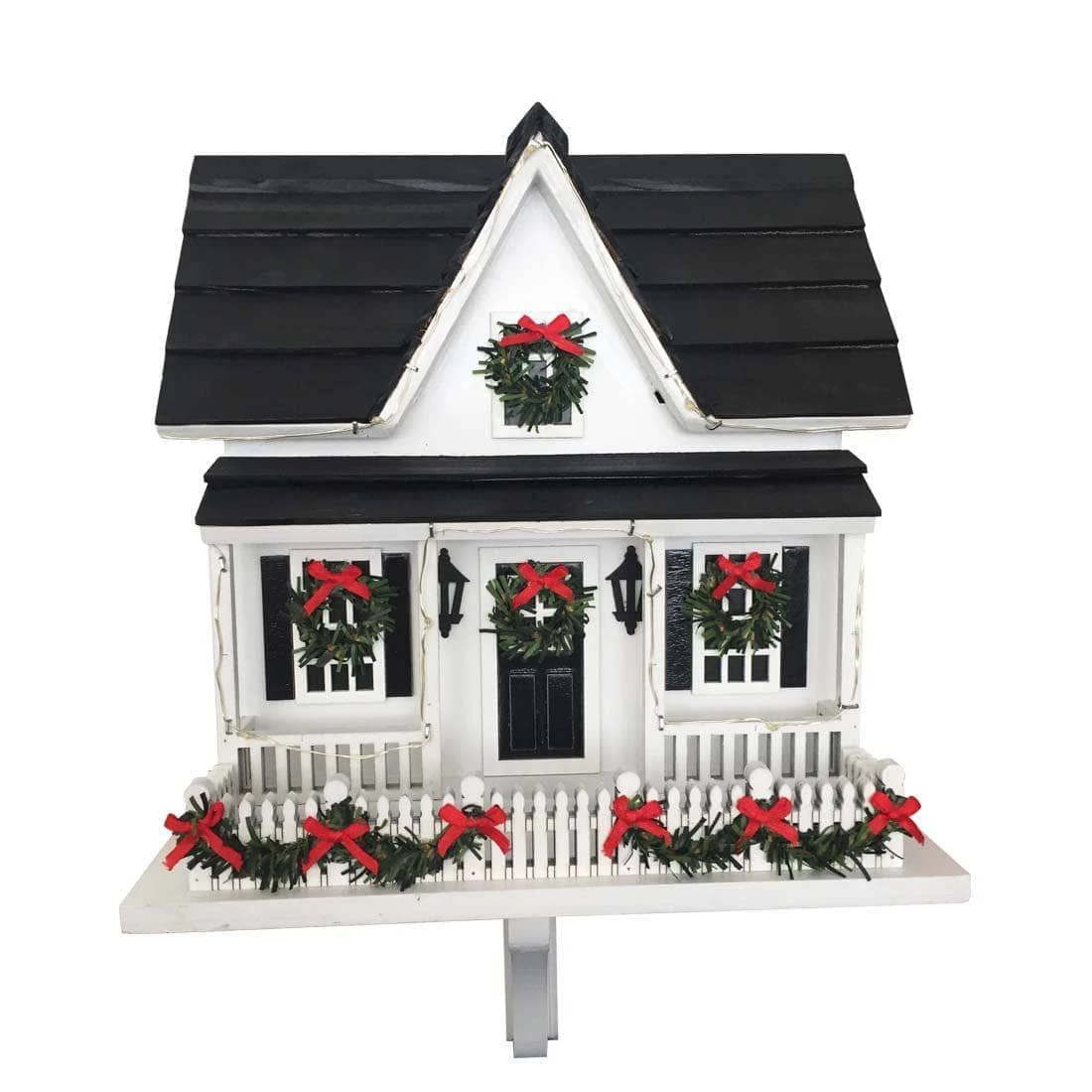Give the birds a beautiful home for the holidays. This delightful birdhouse this a welcomed addition for the holidays to be used inside or outdoors. Decorated with miniature LED Lights, which give the house an inviting warm glow. Holiday wreaths are hung on the front door and windows. We’ve added a spray of garland across the fence that welcomes you and your birds. Details include a great little porch combined with a fully functional removable back wall. Drainage & ventilation, make this the ultimate Holiday Birdhouse. Comes equipped with a mounting bracket for easy installation.