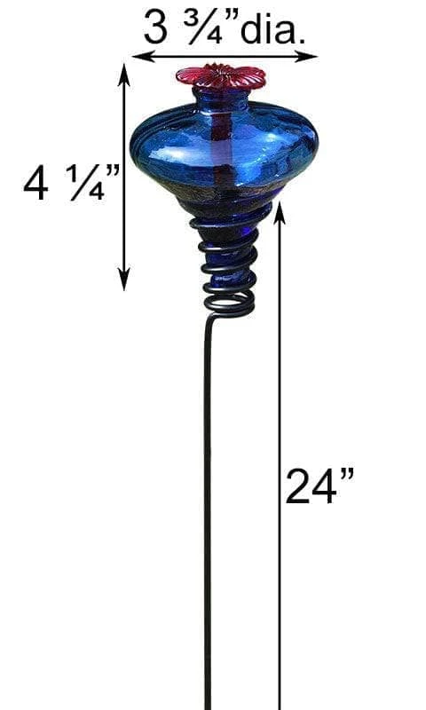 Bring beautiful hummingbirds into your garden with the Blue Mini-Blossom Hummingbird Feeder with Stake. This bold feeder has a dark blue, blown glass reservoir, topped with a red feeding flower. The red on the flower helps attract hummingbirds, while the deep blue reservoir holds 4 ounces of nectar.