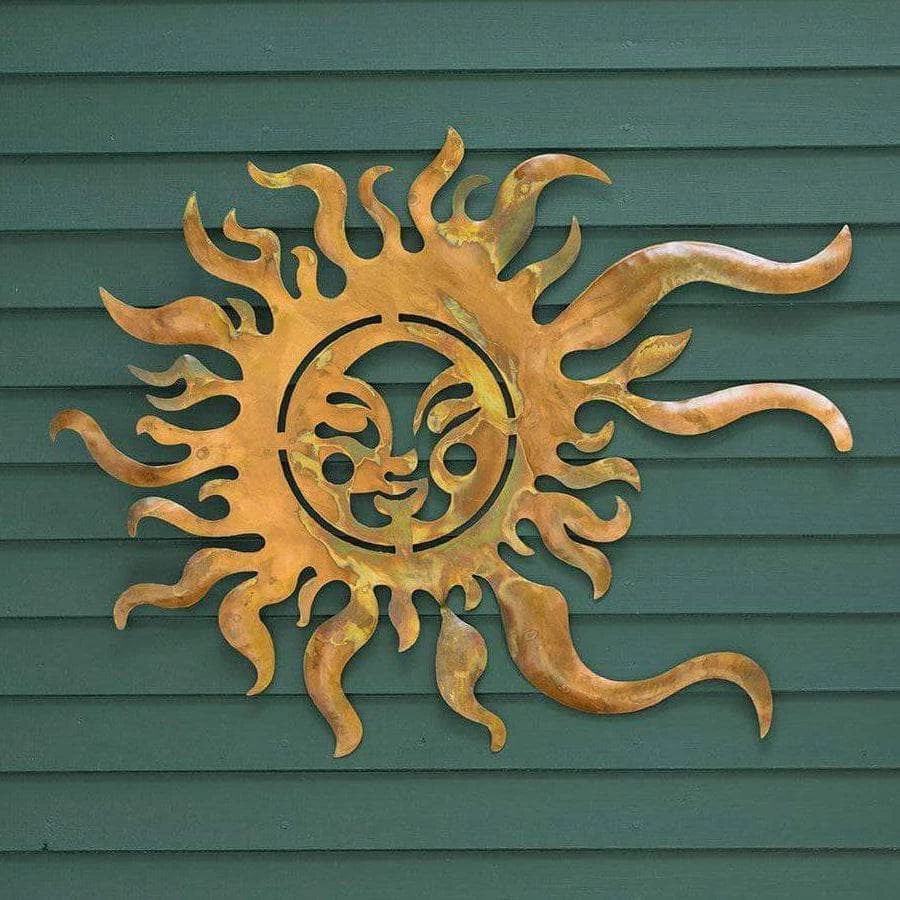 Let the sun shine in with this oversized sun face wall hanging. Big enough to make a lasting impression, we love this piece artfully placed on a porch or attractively attached to wall or fence. Finished in a classic, flamed metal color, this piece is slightly iridescent when exposed to sunlight. We love how natural, cheerful and grand this handcrafted piece is—and we know you will too!