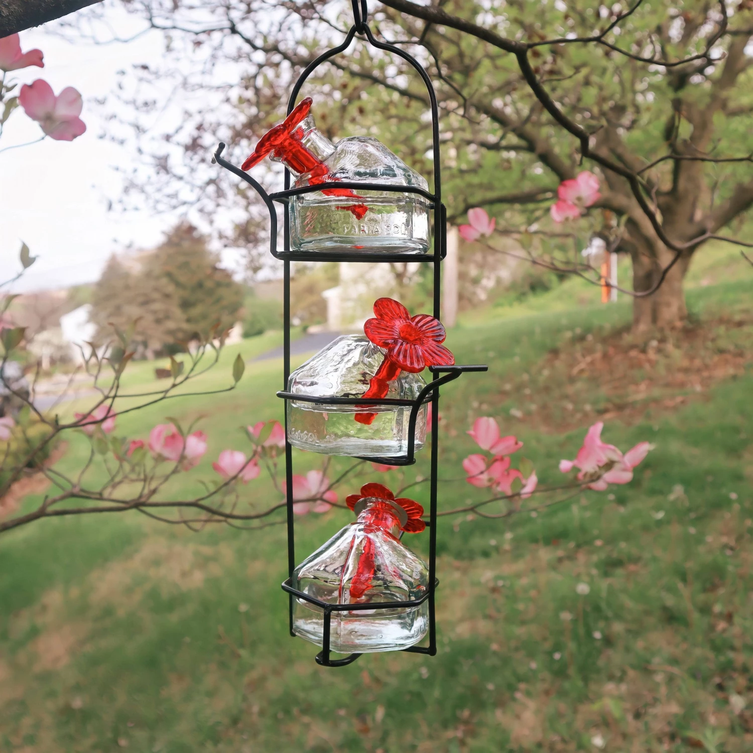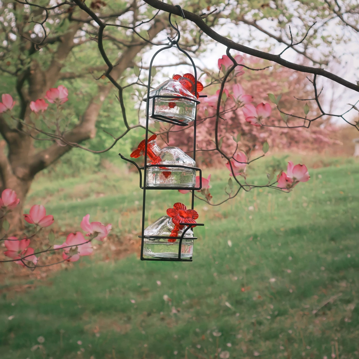 Bright red, shatterproof plastic feeding flowers enhance the clear vessels and mimic trumpet vine to attract the birds, while a black metal frame completes the piece.