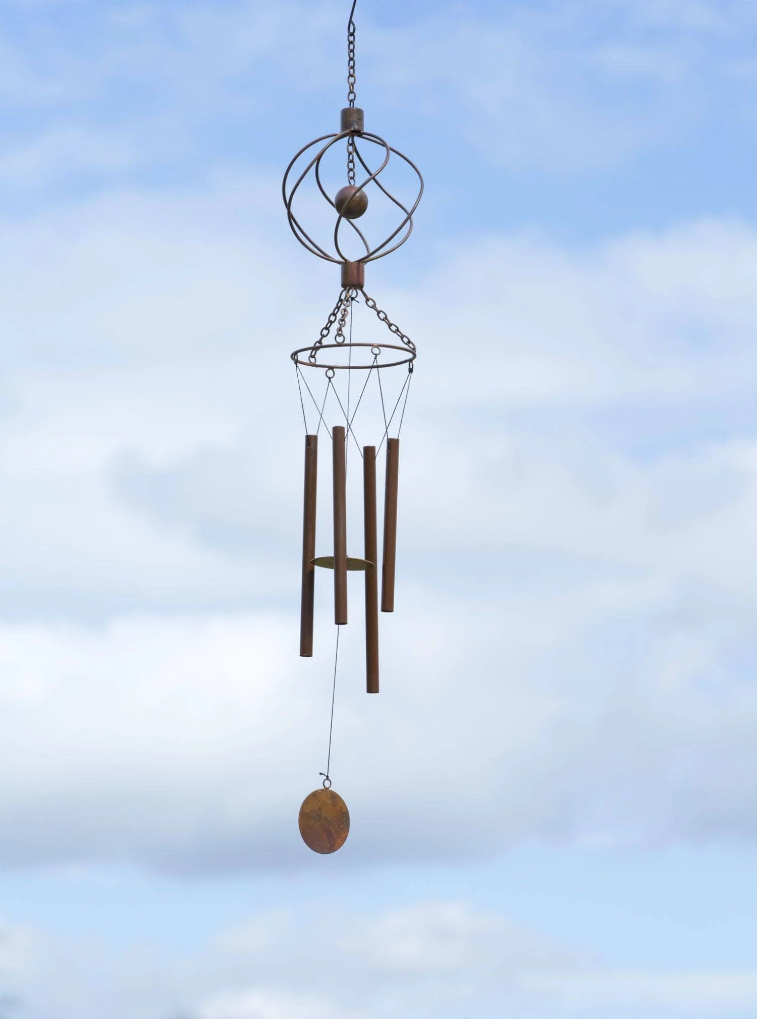 Add some abstract decor to your outdoor space with this Geometric Wind Chime! Flame-finished metal pipes cascade from a circular, hypnotizing centerpiece. From the metallic ball in the centerpiece to the triangular spindles attached to the pipes, this eye-catching wind chime really plays with shapes—and is bound to add some variety to any garden.