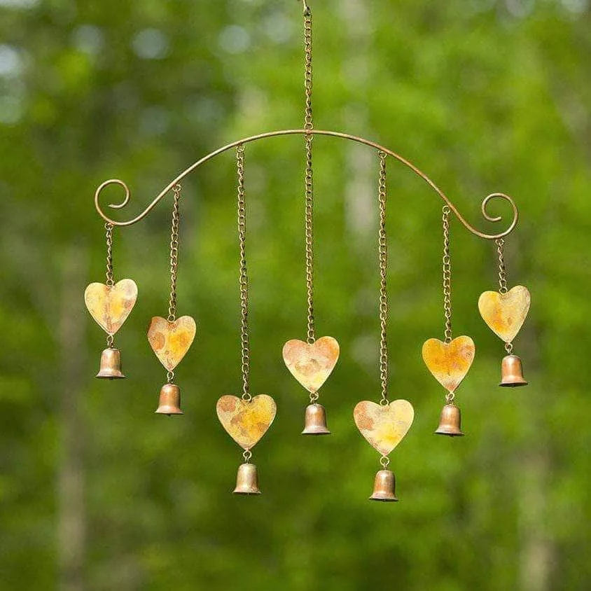Celebrate love with this simple but stunning wind chime. Fashioned with seven flame-finished hearts and corresponding bells, this golden-brown, iridescent piece shimmers in the sun and radiates in the rain. Every time it sings a sweet song or dances in the breeze, you’ll be charmed by its classic good looks and sweet, vintage-inspired vibes. This piece, like every wind chime we sell, has been happily handcrafted for your lasting enjoyment.