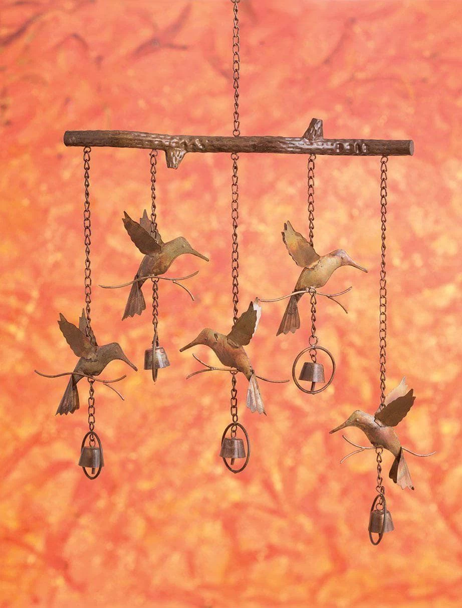Hummingbirds famously symbolize love, good luck and joy. Bring some of their juju into your favorite outdoor space with our Hummingbird Wind Chime. Delicate and elegant, this natural piece has a flamed finish that allows it to look good in every style of garden. Each handcrafted hummingbird helps hold up a carefully detailed bell which rings gently in the breeze. Perfect for a housewarming gift, this item has been carefully constructed by hand.