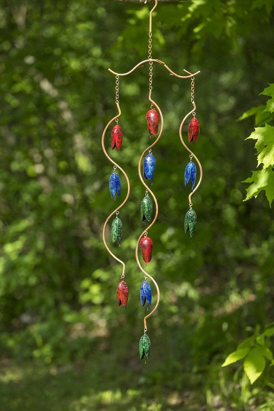 Bring music and marvel to your garden with this unique, bold wind chime. The breathtaking piece features three curvaceous strands of brightly-stained bells in ruby red, emerald green and sapphire blue. Plus, at over three feet long, it truly makes a statement! Hang it from a tall tree, a charming pergola or near your kitchen window—anywhere with high visibility! Like all wind chimes in our Happy Gardens collection, this item has been handcrafted by talented artisans.