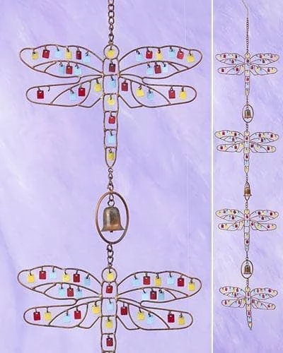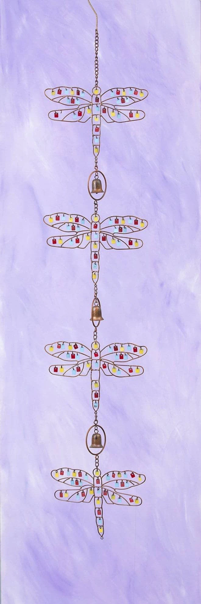The dragonfly is a fascinating insect, so we’ve paid homage to the super-sized bug with this colorful, funky wind chime. This handcrafted ornament features a trio of dragonflies, two bells and tons of red, yellow and blue pops of color. Longer than your average wind chime, this piece is over four feet tall, easily allowing it to make a statement in gardens of all styles and sizes.