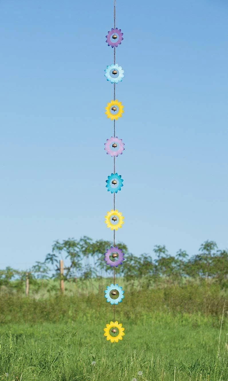 Color, motion, and sound combine in our Multicolor Flower Rain Chain, bringing a pleasing splash of whimsy to your space no matter what the weather. In pleasing tones of yellow, blue, and purple, this sunny piece features nine individual blossoms arranged on a chain that twirls as breezes pass. Graceful, rounded bells provide the perfect finishing touch. Like all Happy Gardens rain chains, this one is handcrafted, and will bring lasting beauty to your patio, porch, or any other area!