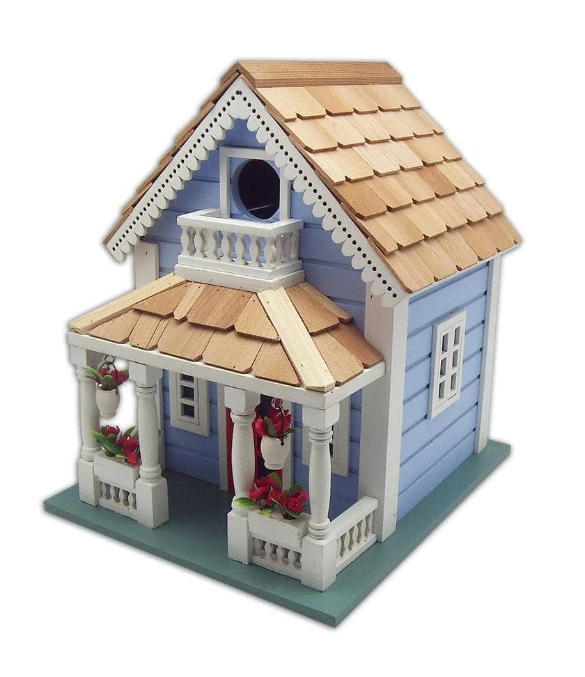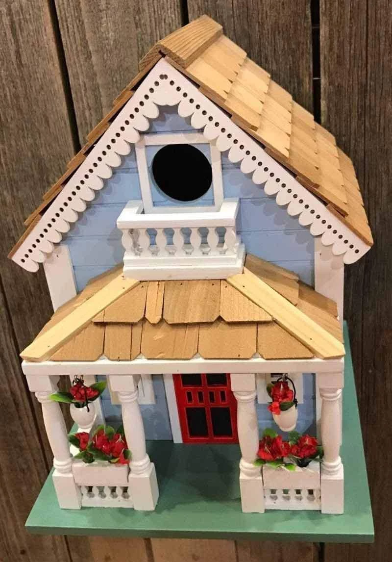 This lovely bird house is rich in detail including a beautiful scalloped red cedar shingled roof and decorative hanging flower pots with red blooms. Painted in baby blue and trimmed in white no detail has been overlooked. We have included all the necessities to keep your bird residents comfortable.