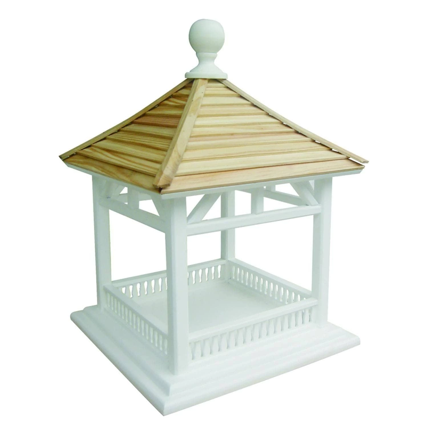 This fly-through gazebo Open Gazebo Bird Feeder is perfect for just about any setting. Constructed of exterior grade ply-board, and topped with a pine shingled roof, the large open area can be used with seed or can easily accommodate a piece of fruit for Orioles to enjoy. This bird feeder holds up to 1 pound of bird seed.