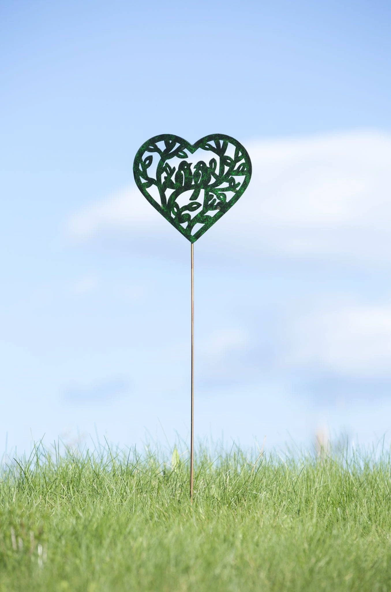 Can’t get enough green in your garden? Add even more verdancy to your outdoor space with our Open Heart with Birds Stake in Emerald! Live in a desert? This piece will make your garden even lusher—no rain required. Plus, the stake features a heart with two love birds inside, surrounded by branches. Handcrafted and ornate, this stake will make all your neighbors green with envy.