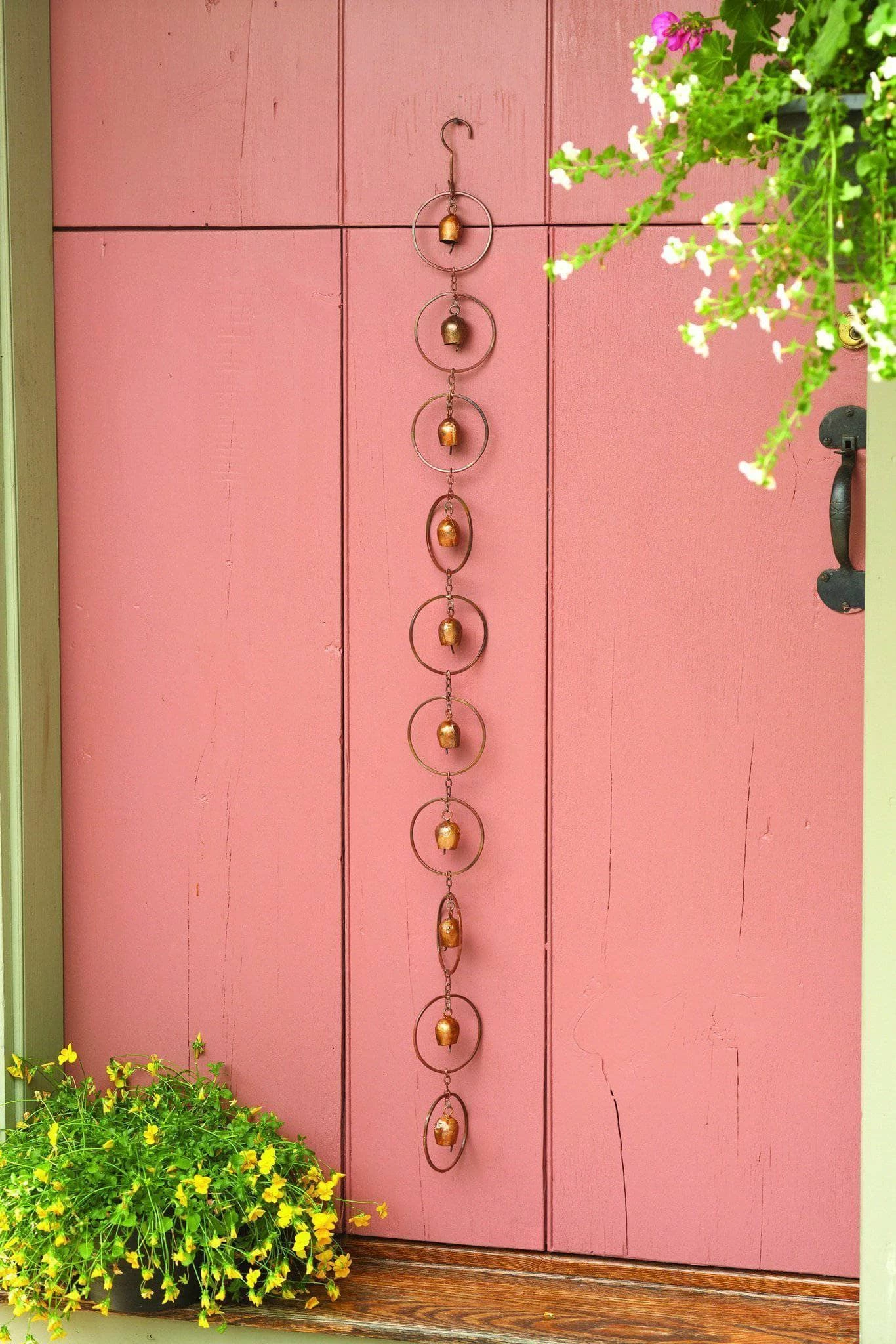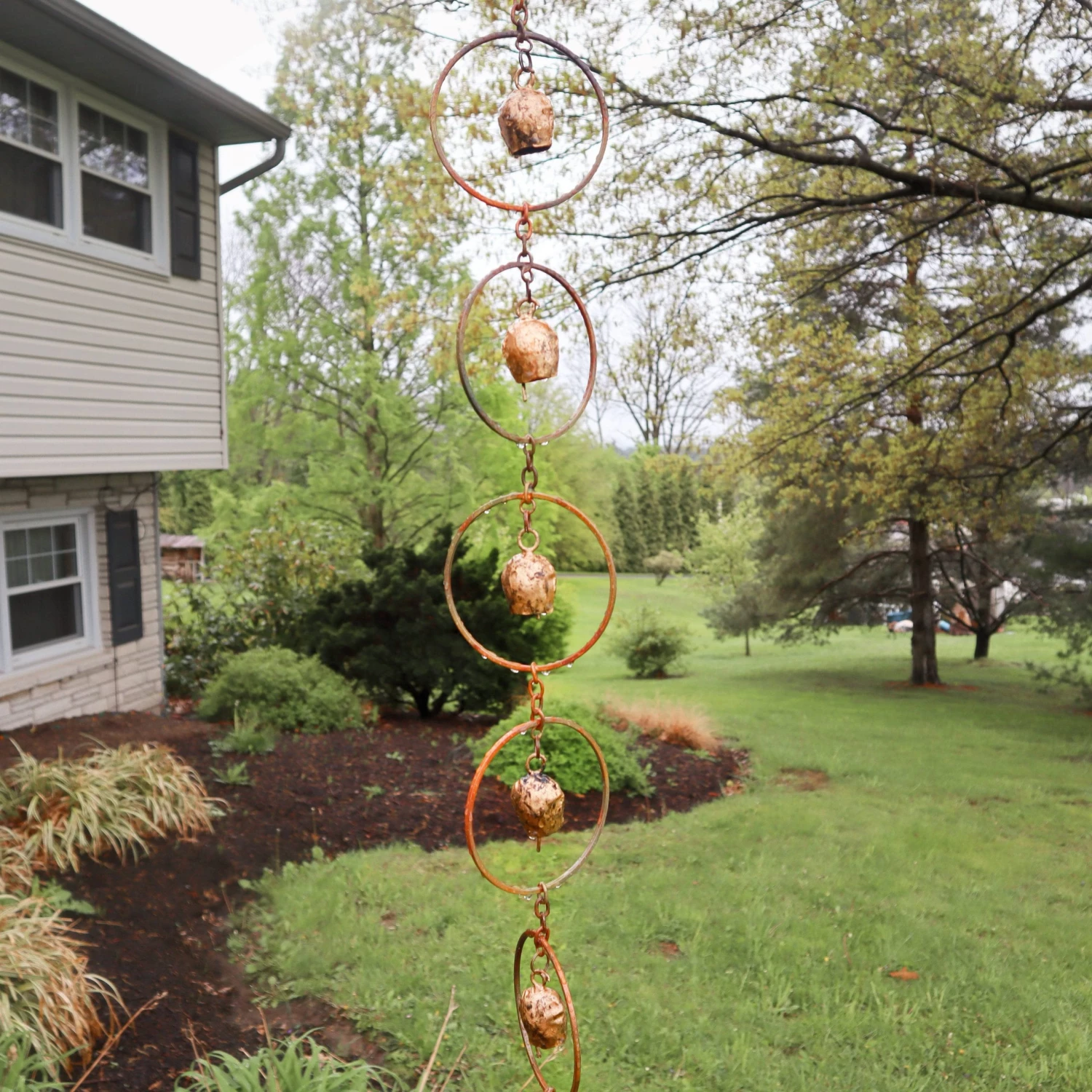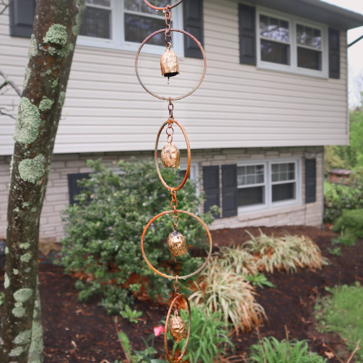 Ten beautiful bells framed by lovely flamed circles bring a tranquil sound to your favorite outdoor entertaining area each time the breeze blows. Simple and sophisticated, this piece is just right for the garden, porch, or pergola, or for placing beneath an overhang near a window. Like other hanging ornaments from the Happy Gardens collection, this one has been individually handcrafted, and will bring lasting beauty to your home.