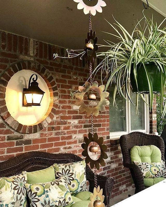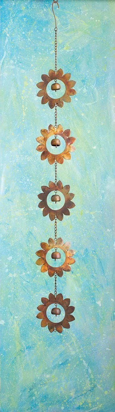 Celebrate the warmth and beauty of the garden with our Flamed Flower Hanging Ornament. A gorgeous piece that’s versatile enough to display throughout the seasons, it offers five cheerful flowers, each framing a round bell with a stylized clapper. Soft chimes ring when breezes blow, adding even more pleasure to your outdoor experience. Like all hanging ornaments from our Happy Gardens collection, this piece has been individually handcrafted, and will bring lasting beauty to your patio, porch, or garden.