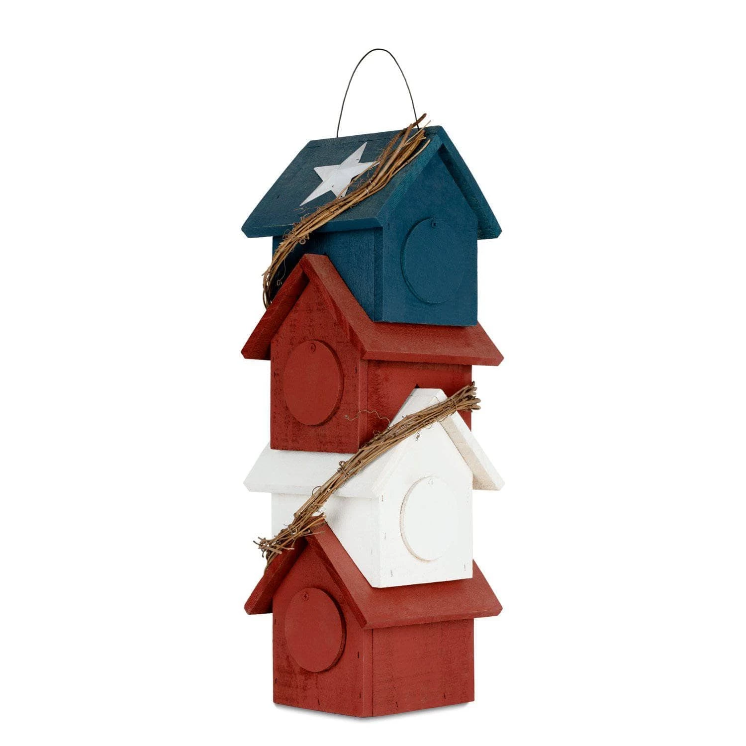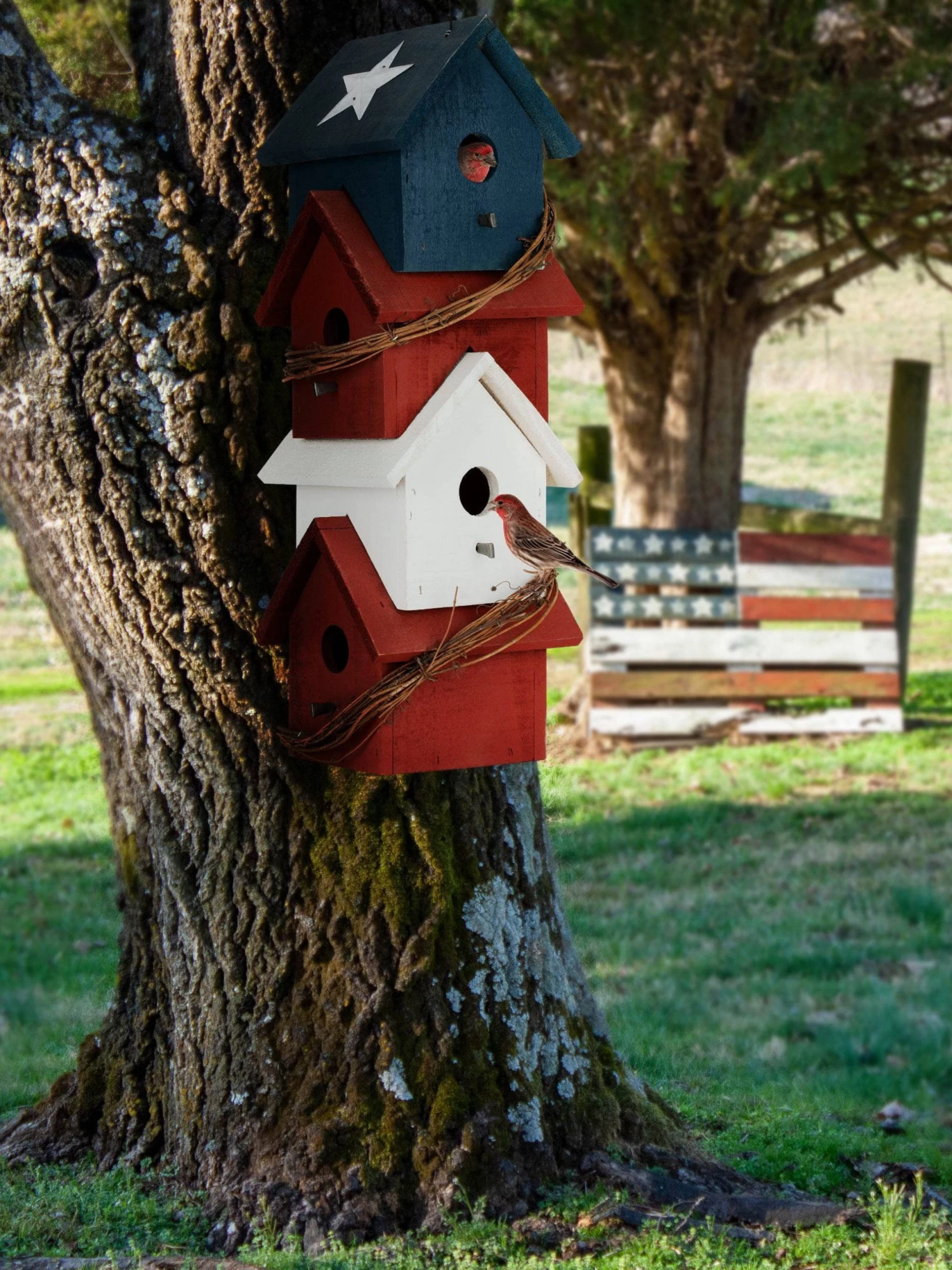 Made of solid pine the Piedmont Patriotic birdhouse is painted with outdoor paint and decorated with a sturdy twig garland & two metal stars. The ideal residents include woodpeckers , wrens, swallow & bluebirds.