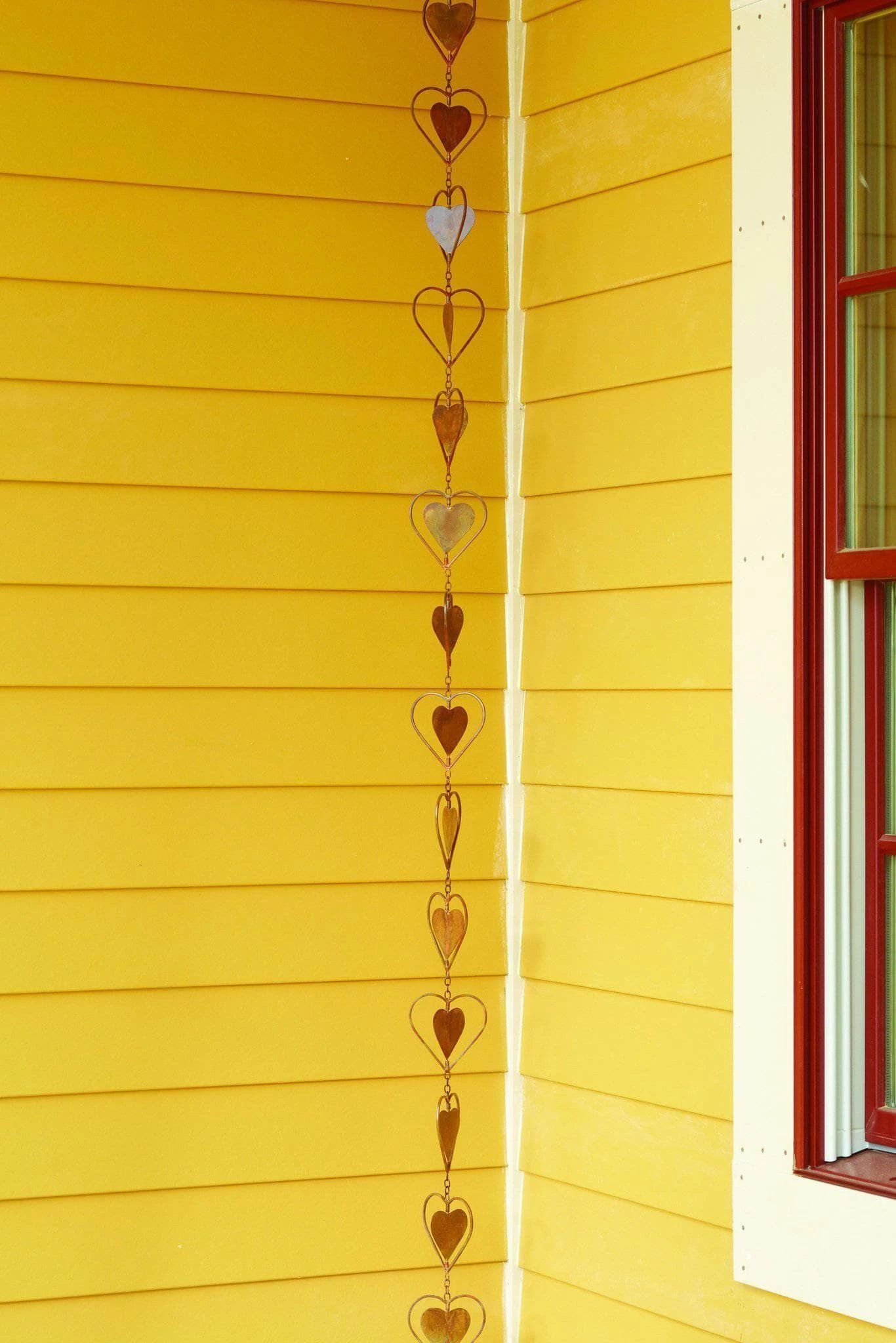 A lovely alternative to a downspout! Our Flamed Heart Rain Chain looks amazing no matter what the forecast brings. During sunny weather, you’ll love the way the finish offers a slightly iridescent glow; when it’s raining, you’ll appreciate the sight and sound of cascading water. Like other Happy Gardens rain chains, this one has been individually handcrafted, and will bring lasting beauty to your home.