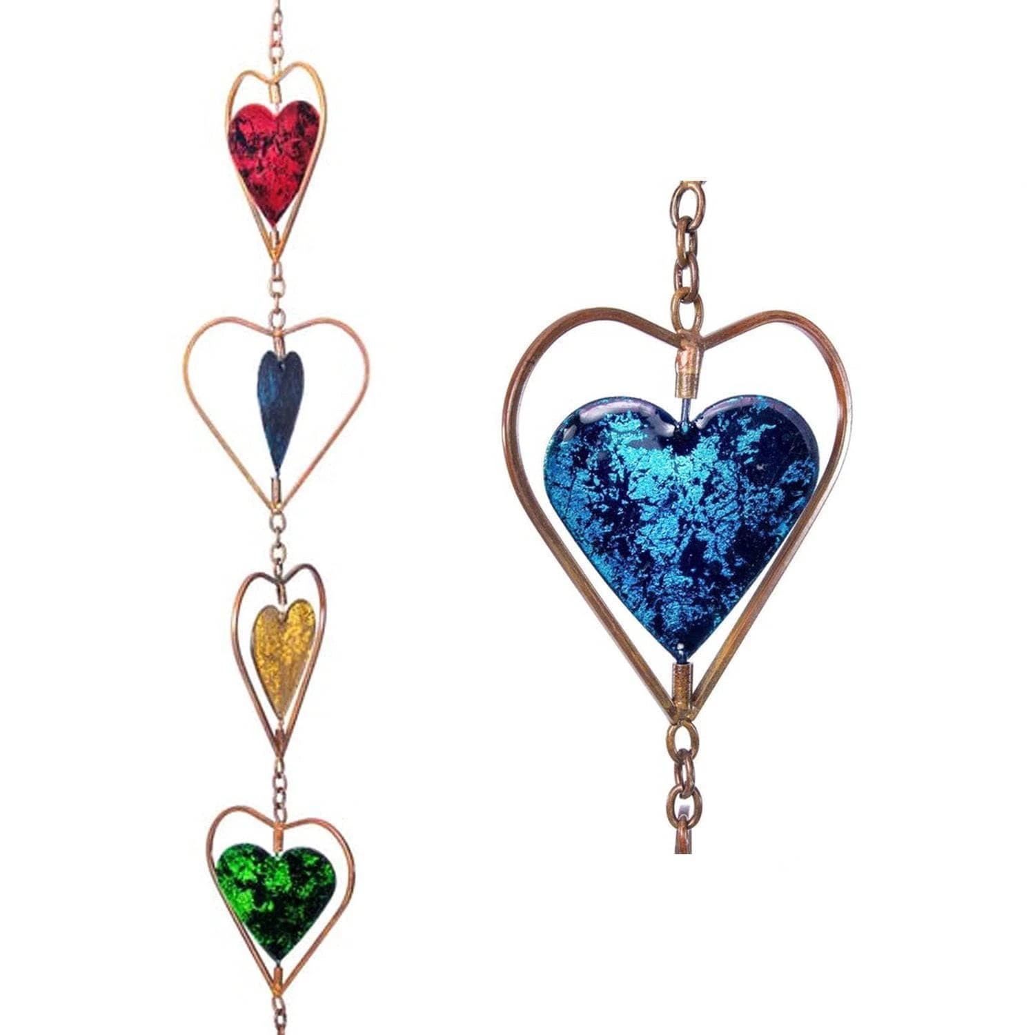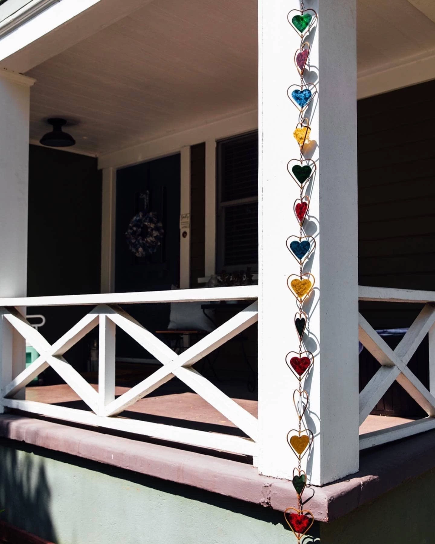 This charming, colorful rain chain will bring a touch of sweetness and a whole lot of love to your front porch. Our Multicolor Heart Rain Chain is cheerful and bright, featuring twirling heart panels that spin under pressure. We love this rain chain when rainwater trickles down, but it’s just as pretty on a sunny, cloudless day. Like all the items in our collection of rain chains, this one is individually handcrafted and designed to last many years.