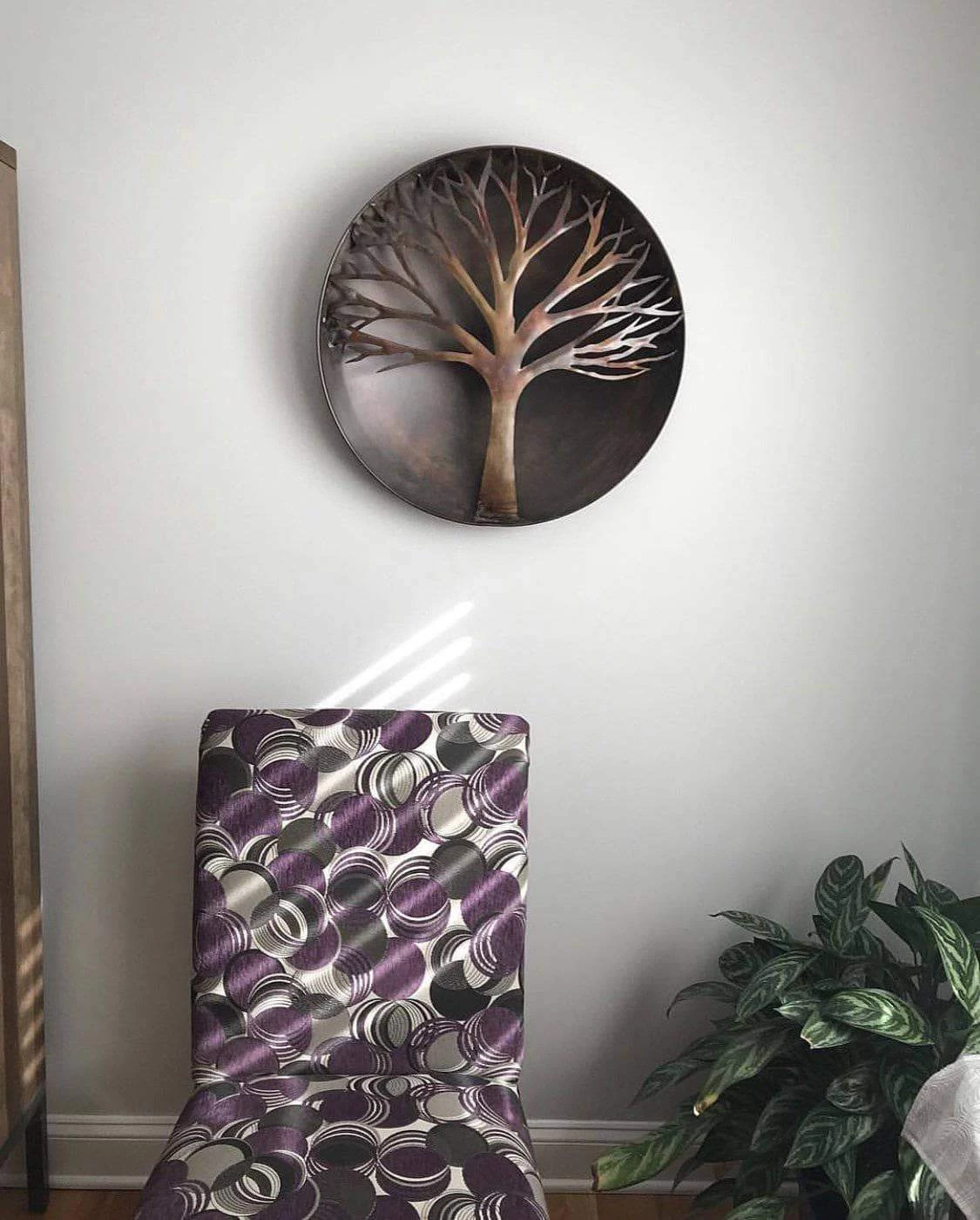 Bare limbs outstretched, a winter tree reaches hopefully toward the sun. Our 24” Flamed Raised Tree Wall Disc celebrates the circular cycle of nature’s seasons while adorning your space in spectacular style. The flamed finish provides a subtle glow and a wash of warm, natural color, and the elevated outline offers pleasing contrast. Like other Happy Gardens wall decor, this disc has been individually handcrafted, and will bring lasting beauty to your surroundings.