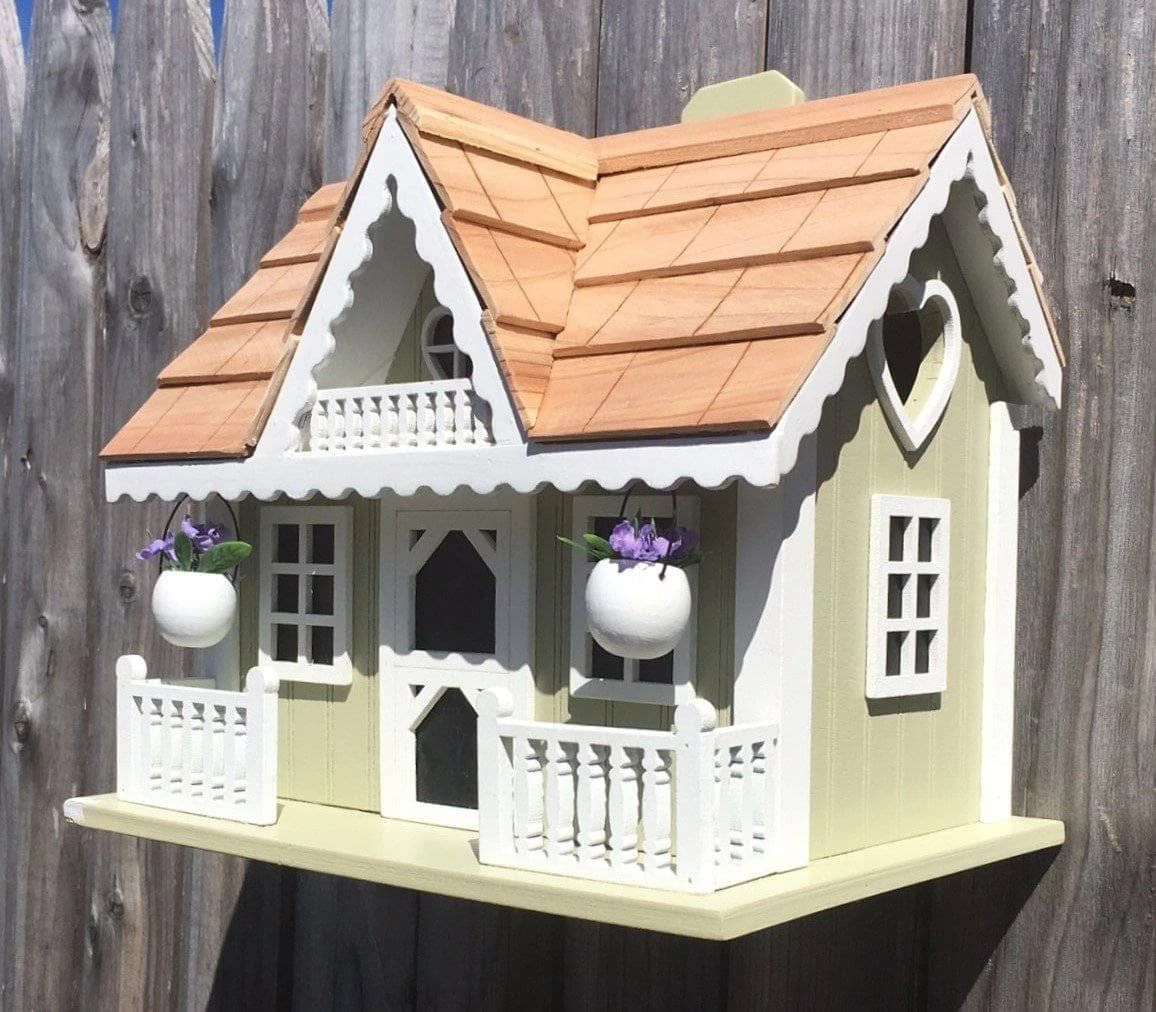 Rosemary Cottage is the next door neighbor to our Sweetheart Cottage. The garden zoning will allow you to set up a birding refuge right in your backyard. Beautiful hanging baskets with lavender colored flowers adorn the front porch of this rosemary green paint. The ornate white trimming and heart shaped cut out allow your birds to come in and out while building their cozy nests for spring. The unpainted inside of this wood structure has a ladder made from screen to assist the fledglings their escape into the world. This is one house you won’t to miss.