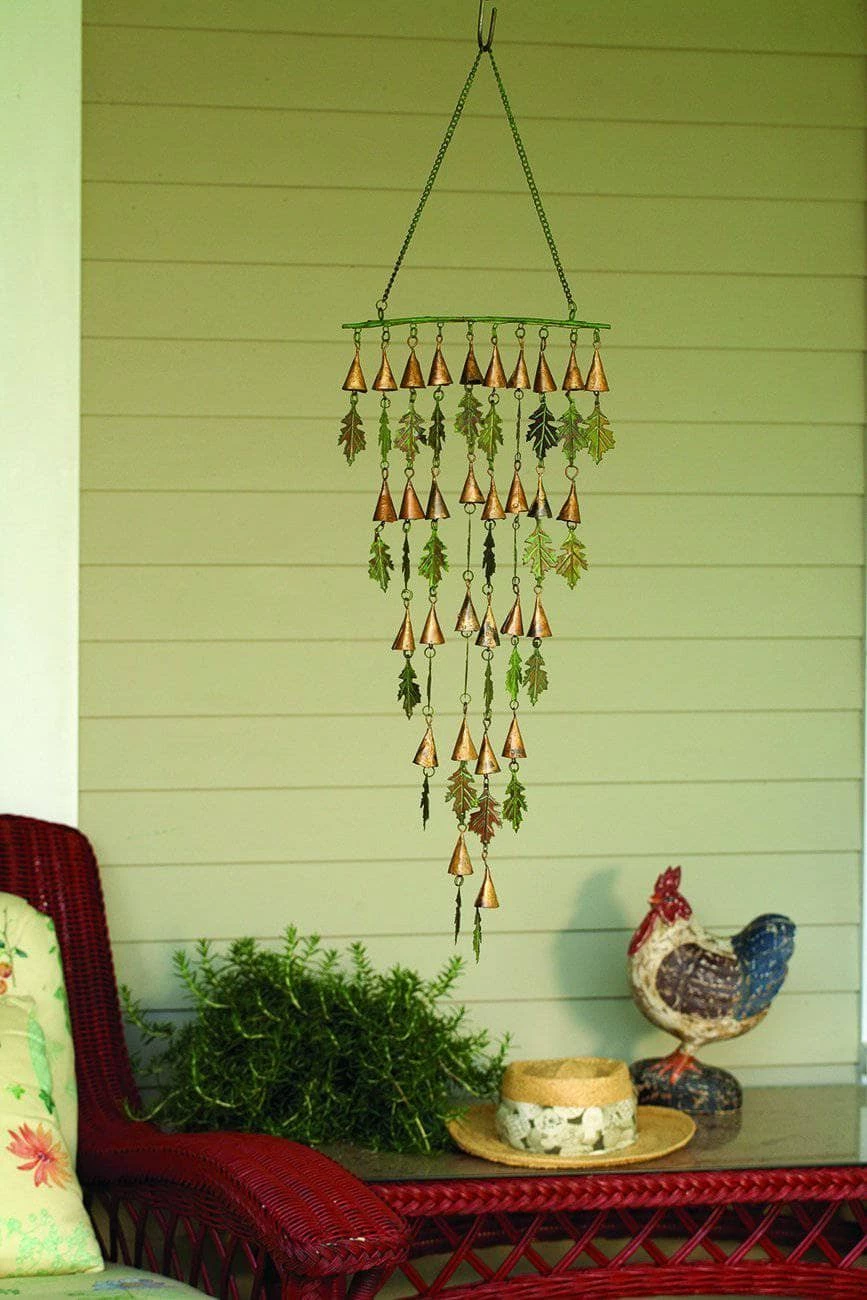 Little breezes provide graceful swaying motions, encouraging tiny copper bells to sound their soft, sweet voices. Verdigris leaves celebrate the passing of seasons while adding a lovely contrast. Suspended from a simple verdigris branch with a pretty hanging chain to match, this beautiful set of shimmering bells delights the senses. Like all Happy Gardens mobiles, this one is handcrafted, and brings lasting beauty to your home.
