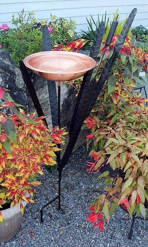 Turn your landscaping into a faux wetland by placing this Copper Single Cattail Bird Bath within your flowers. The lasting, metal body, bold color scheme, and familiar shape of this item add a dynamic look to your garden, and showcase your love of wetlands and the natural world. Wrought iron rods create the leaf and cattail shapes, perfectly surrounding the included, 12.5″ diameter, polished copper bath. This basin affixes to one of the stalks on the stand in moments, and its fantastic rim provides perching and preening spots for your feathered friends.