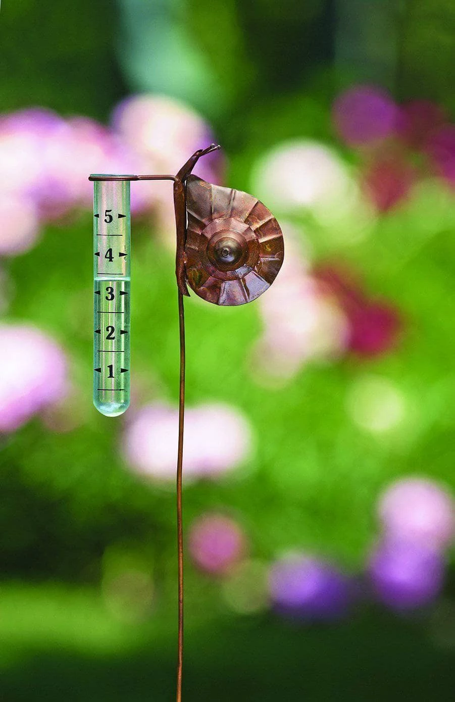 With exquisite spiral shells that symbolize the circle of life, the humble snail reminds us to slow down and enjoy the simple things. This cheerful fellow has paused atop a rain gauge, where he shows off his beautifully sculpted shape and his stunning flamed metal finish, which is versatile enough to complement other garden décor without any risk of clashing. A well-marked glass vessel captures raindrops, allowing you to keep tabs on precipitation levels. Like all Happy Gardens rain gauges, this one is handcrafted, and brings lasting beauty to your lawn or garden.