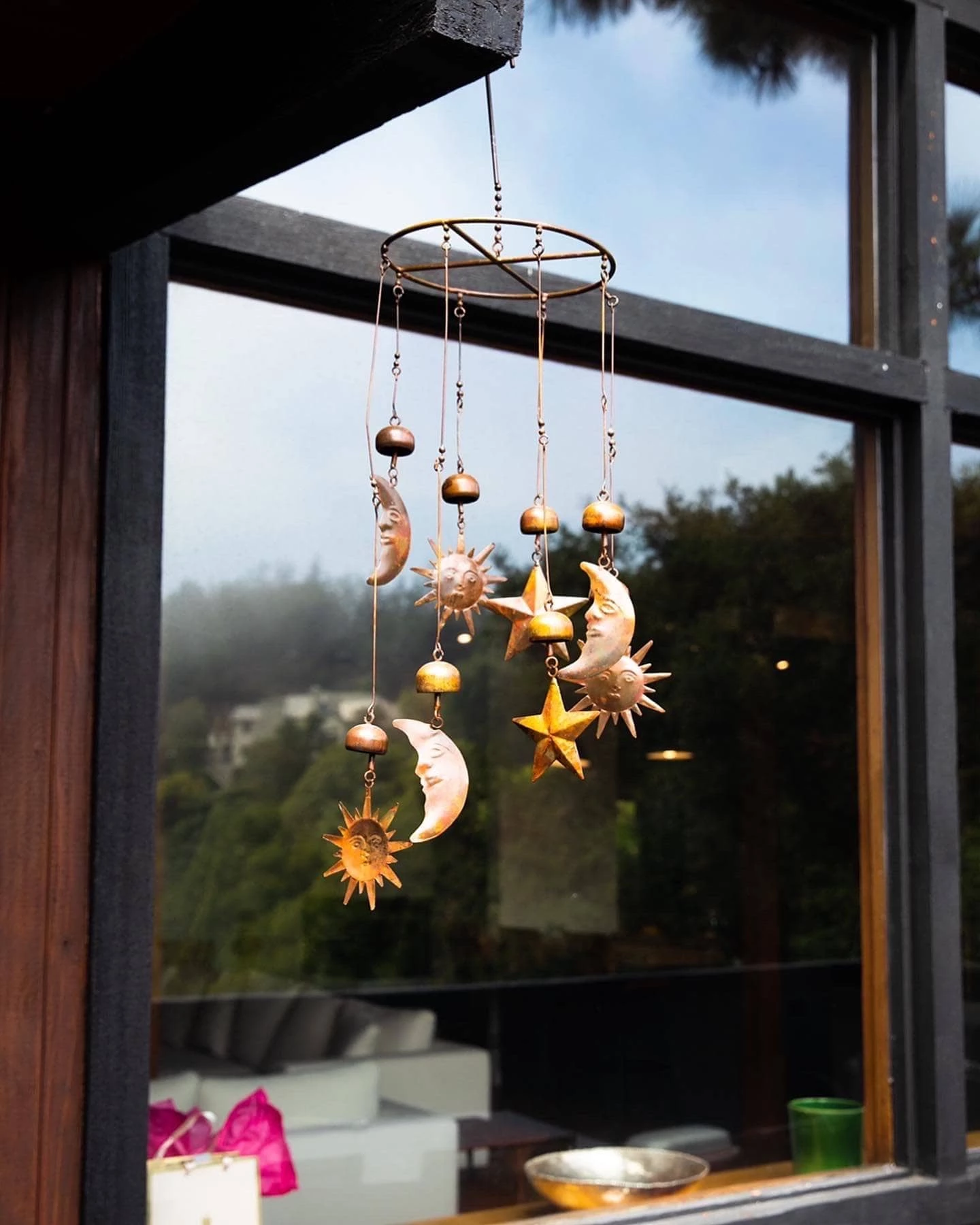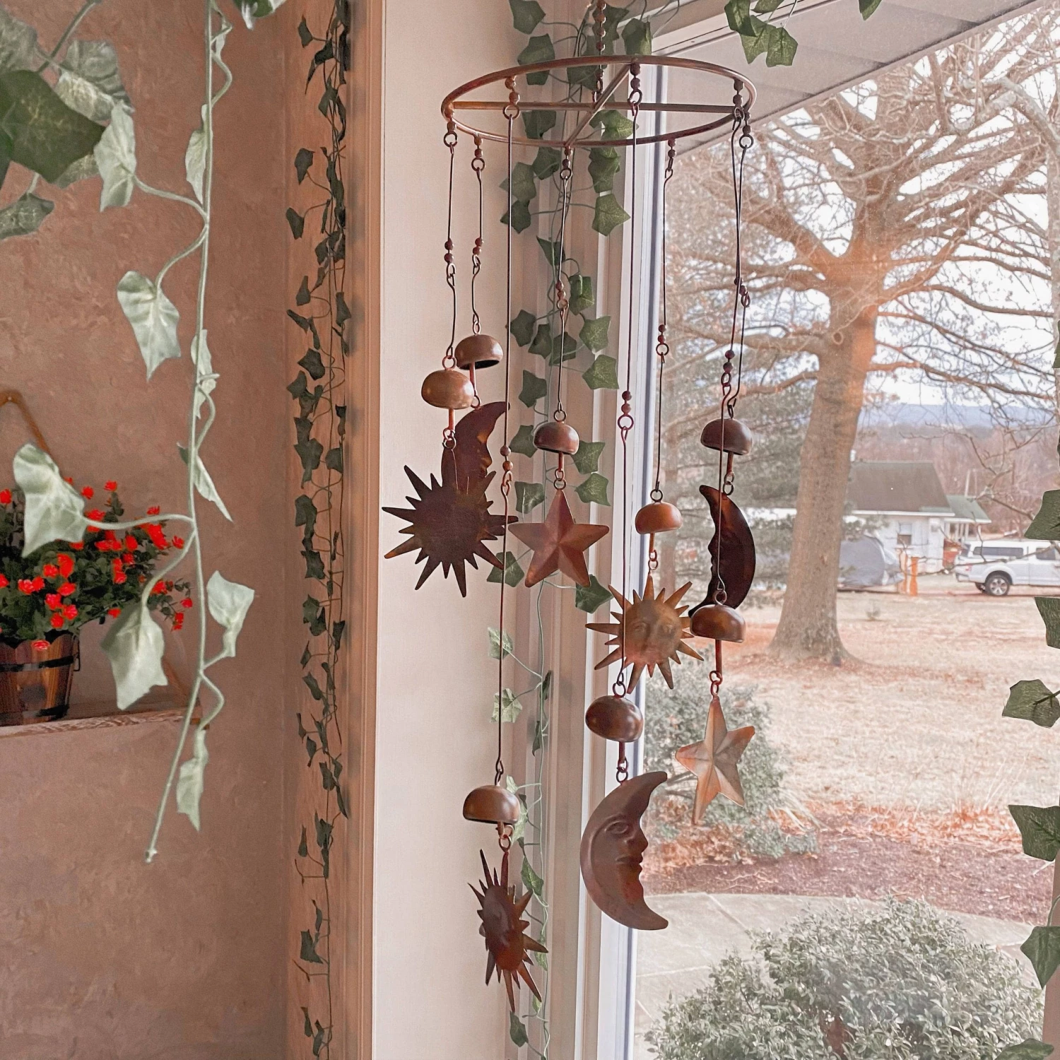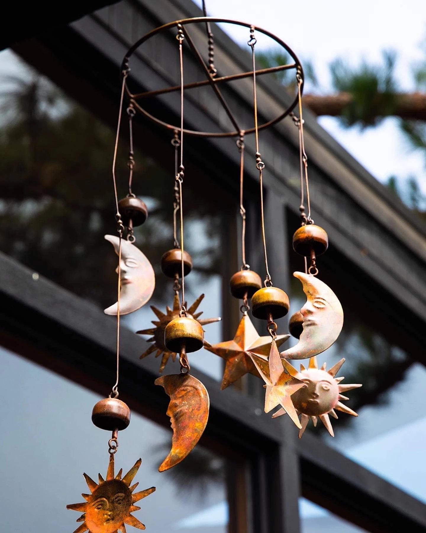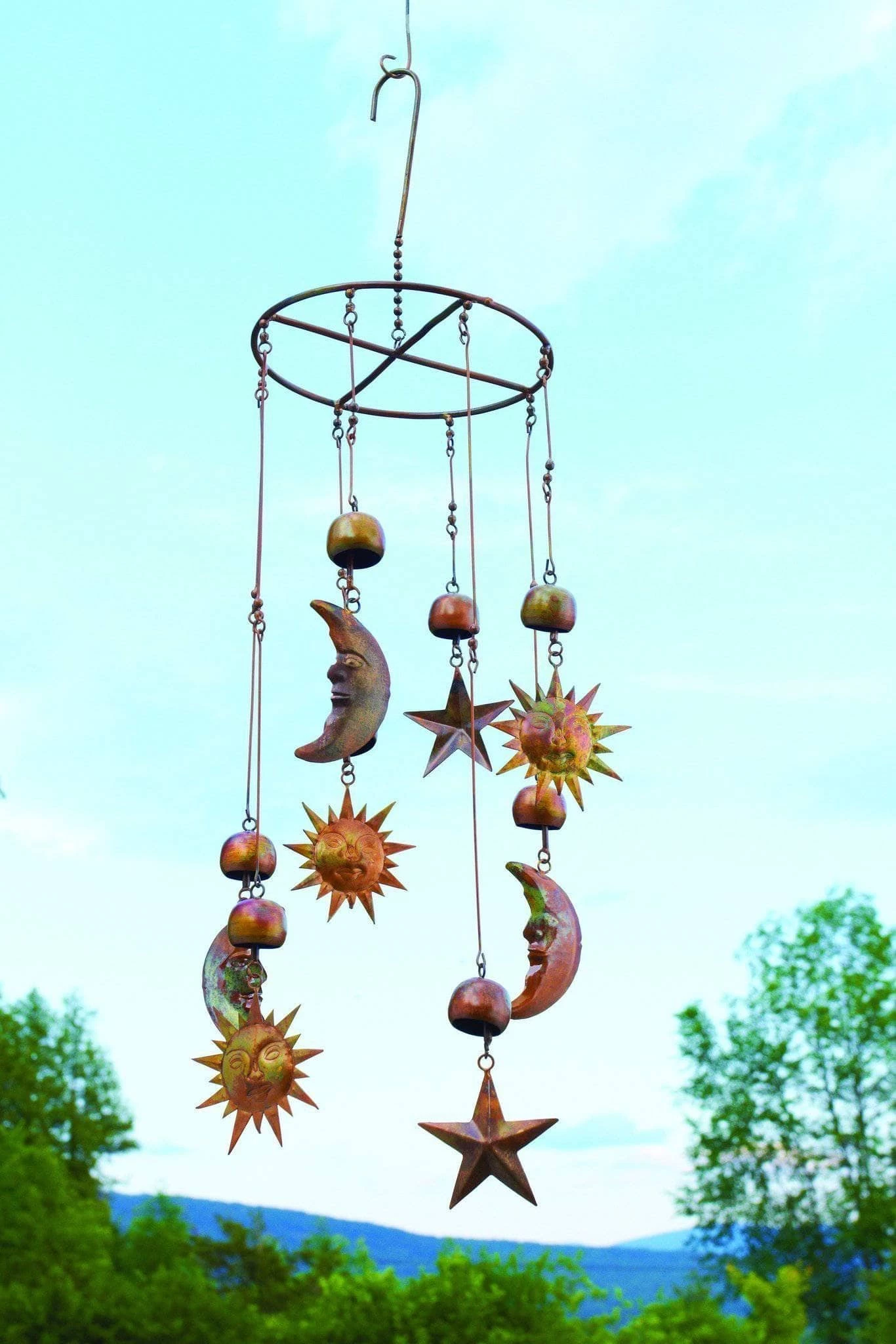 Bring the sun, moon and stars into your own backyard with this celestial mobile. The circular mobile, which also features bells, chimes gently when it sways in the breeze. The natural-colored pendants go well with just about every style of home and garden, making this piece a great gift for friends and family. Like all Happy Gardens mobiles, this item has been individually handcrafted.