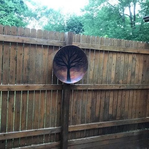 Bring a touch of simple elegance to any indoor or outdoor space. Our 24” Flamed Tree Wall Disc makes a favorable impression via its subtly colorful finish and its sleek outline. A contrasting tree silhouette serves as a reminder of our ever-changing seasons and the pleasures that they bring. Like other Happy Gardens wall decor, this disc has been individually handcrafted, and will bring lasting beauty to any setting.